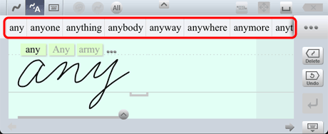 instead of tapping an alternative in step 4, handwritten letters are converted into text as they are recognized, and then the text is entered. A space is inserted at the end of the text. In this case, the entered text is not learned.