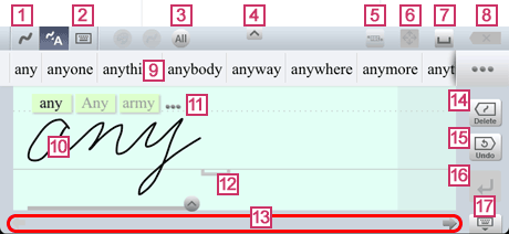 - Displays recognized alternatives for the letters written in the input area. You can select a different recognized alternative or delete what you wrote.