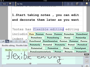 You don't have to write or type whole sentences. 7notes HD has a state-of-the-art predictive engine with natural language technology. An alternative display appears while handwriting or inputting through our predictive engine. Our predictive engine generates an alternative display to suggest the correct word and all you have to do is tap the desired word on the alternative display. If there is more than one alternative, you can extend it to see more alternatives.