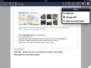 7notes HD has unit variations such as "Text Unit", "Image Unit" and "Web Unit". Users can promptly develop a note from images or web pages. Wherever the location of the image or web page, users can add comments to their notes. Notes with embedded images and/or web pages can be published instantly via Twitter or Facebook to show friends or colleagues.