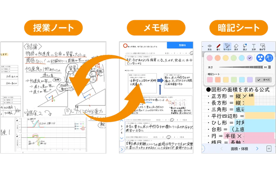 MetaMoJi ClassRoomのデジタルノートは、紙に書くように繊細なノートテイキングができるだけでなく、学びを支える豊富な機能を備えています。アイデアや切り抜きを書き溜めて再利用でき、2画面活用で学びを深める「メモ帳」や、マーカー部分を隠して学習できる「暗記シート」など、学習に役立つ新機能も搭載しました。また操作に手間取って思考をさえぎることのないよう、使い勝手にもこだわっています。