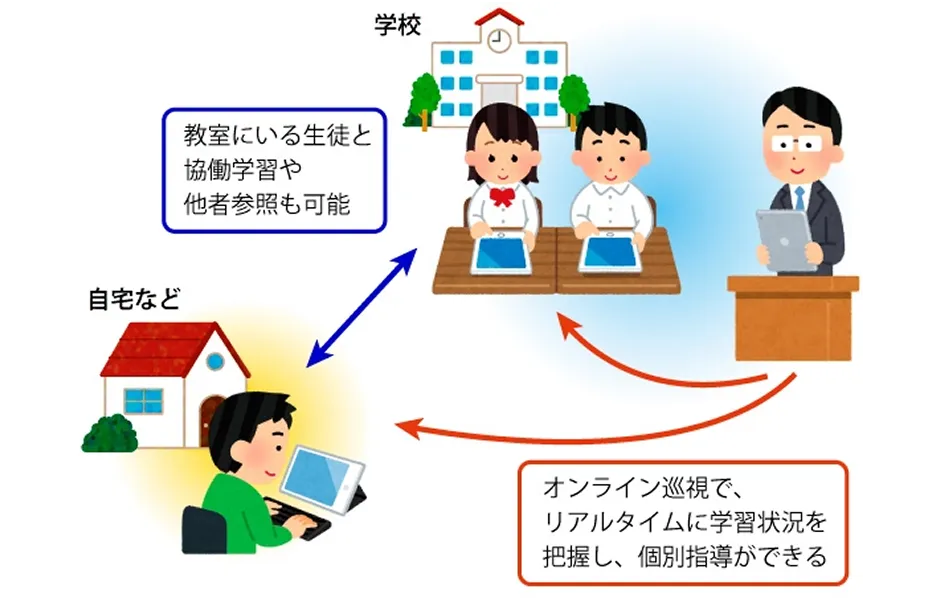 また、教室にいる児童生徒と、協働学習や他者参照を行うこともできます。