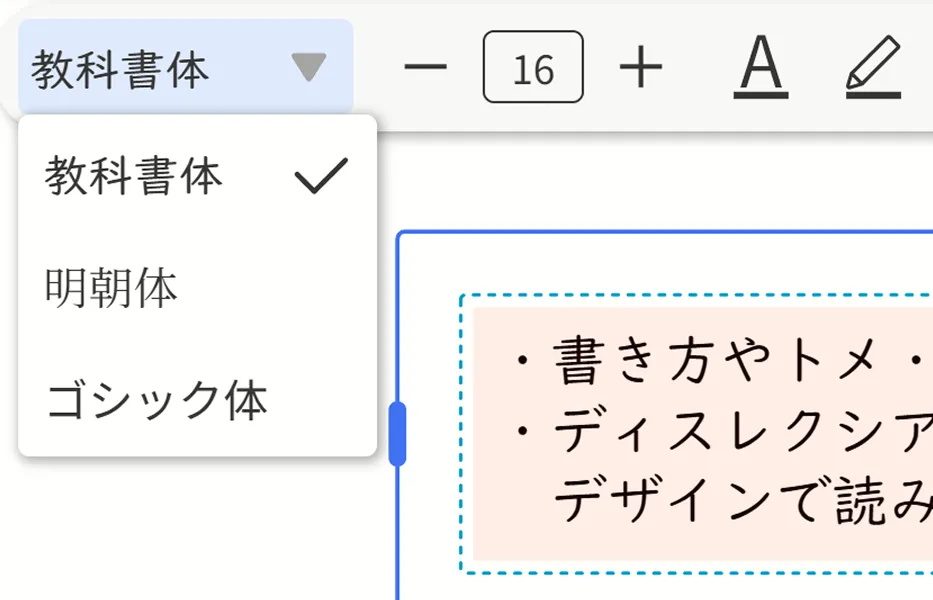 読みやすさ、教えやすさへの配慮から、UDデジタル教科書体を搭載しています。教科書と同じ字体でPC画面でも見やすく、全OSで使用できます。