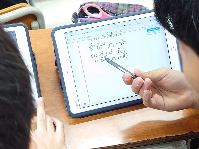 菅先生が担当する大分南高等学校3年生の数学の授業は「昨日の問題をみんなで確認して」という先生の声かけから始まりました。生徒たちは2、3人でメタモジのノートをお互いに見せて話しあったり、1人でノートを見直したりしながら確認します。このように自分たちのペースで学ぶ時間では、先生は机間巡視をしてフォローします。その後、菅先生が説明しますが、この時点では先生は板書をしません。教材がすでにメタモジで全員に共有されているので、メタモジのレーザーポインター機能で重要な部分を指し示しながら説明していきます。