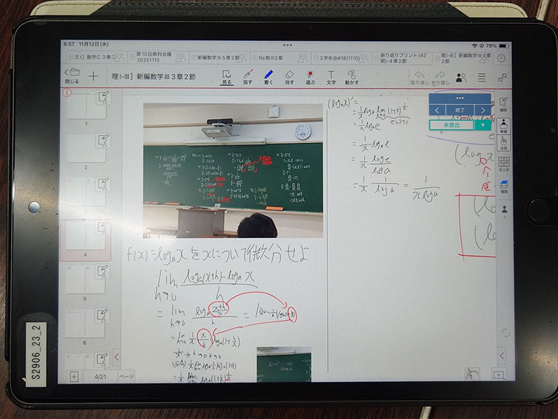 2021年度にいち早くメタモジを使い始めたのが、数学・情報の菅淳司先生です。その2年ほど前にメタモジを知り、試験的な運用を経て導入しました。メタモジに注目した理由について菅先生は「数学は手書きが多い教科なので、メタモジは手書きがしやすく、画面の拡大・縮小が自由にできるのがいいですね。また、私は日頃から生徒に対して『ノートに書いたことが間違っていても消すな』と言っています。間違いから学ぶことが大切だからです。メタモジでは間違った部分を選択して別の場所に簡単に移動できるので、生徒が間違いを消さずに残し、あとから見直すということを実現できるようになりました」と語ります。