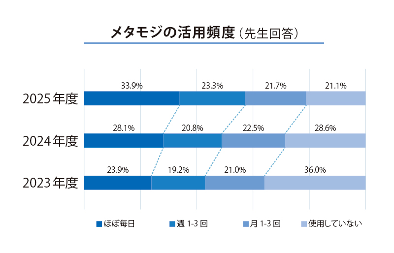 教育庁では、メタモジの利用に関して毎年調査を実施しています。これによると「授業において利用している」と回答した先生の割合は、2023年度が64%、2024年度が71%、2025年度が79%と、年々上がっています。メタモジの利用について教科の偏りは見られず、探究の時間やホームルームなどにも活用されています。