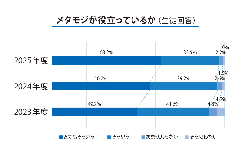 生徒に対する調査でも、メタモジが役に立っていると回答した割合は年々上がり、2025年度には96.8%に達しました。生徒からは「課題提出が便利」「日々のノートの整理や見直しがしやすい」「生徒同士で意見の共有ができる」などの声があり、佐藤氏は「生徒が使ってほしいと思っているから先生方の利用率が上がっているという側面もあるかもしれません。学校にとってなくなったら困る存在になっています」と語ります。