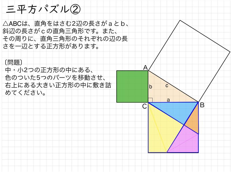 - パズルの結果から、直角三角形の斜辺以外のそれぞれの辺の長さの2乗の和が、斜辺の長さの2乗と等しいことに気づく。
