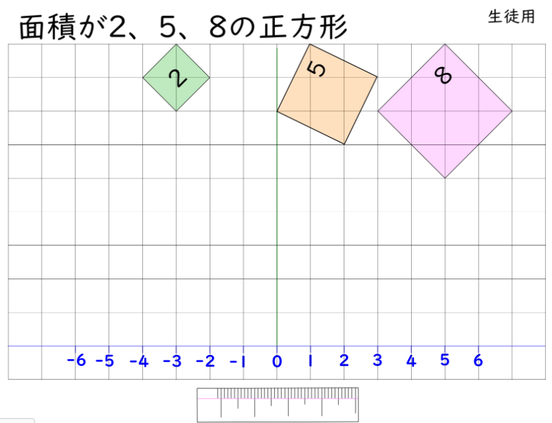 メタモジの図形機能を使い、いろいろな面積の正方形を作らせ、数直線上に並べることで、無理数の存在を確認するとともに大小関係をつかませた。