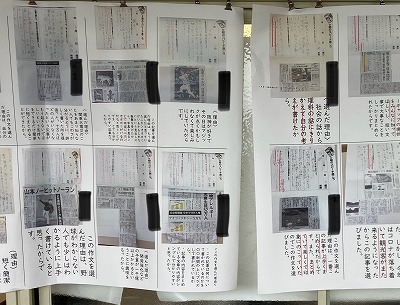 一人一人が書いた文章を大きな紙にまとめて掲示し、文章を読み合おう。