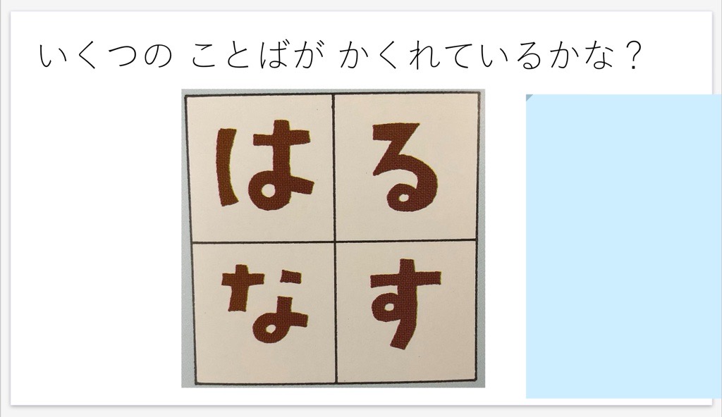 「ことばのこばこ」(和田誠)を紹介しながら、「めくり」機能を使うことでゲーム感覚で言葉に親しむことができた。
