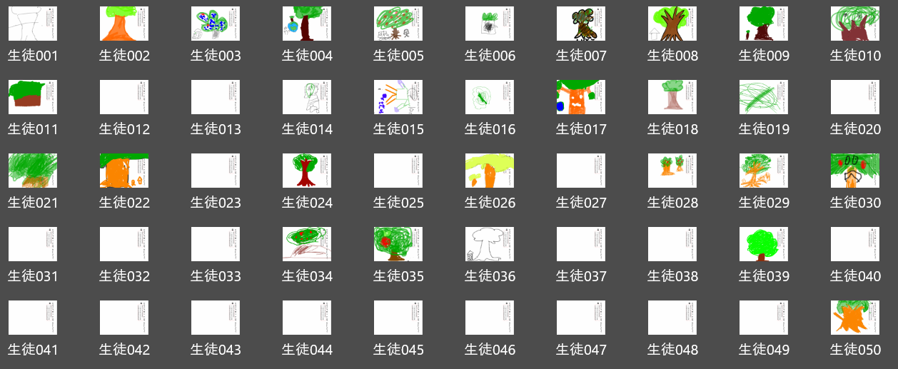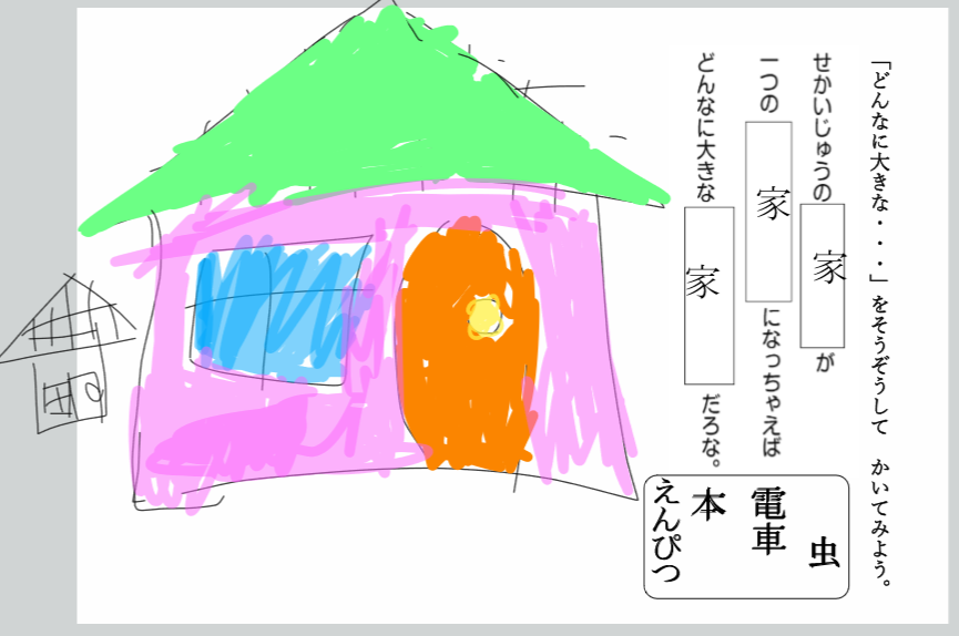 ・「せかいじゅうの〇〇が、1つの木になっちゃえばどんなに大きな〇〇か」好きなものを想像して書かせる。(想像できない児童の為に、レイヤーで言葉を動かせるように用意しておく。)