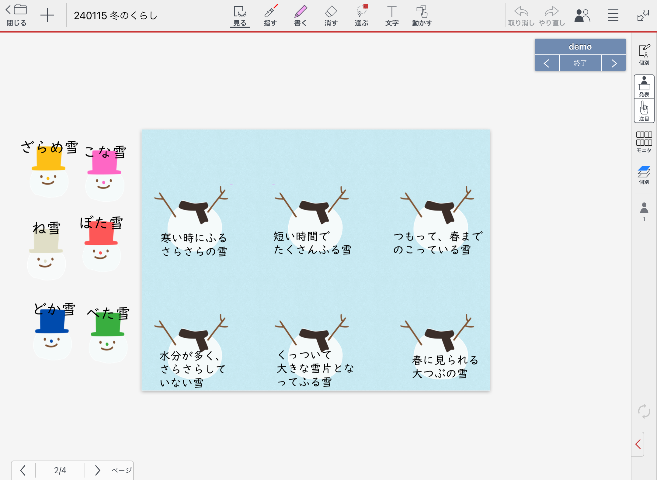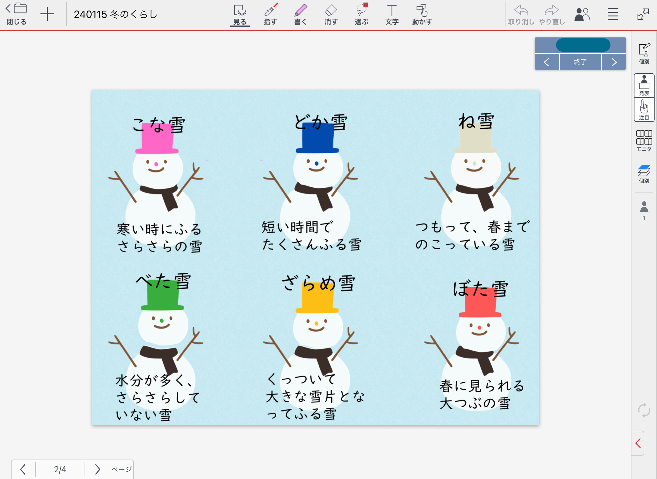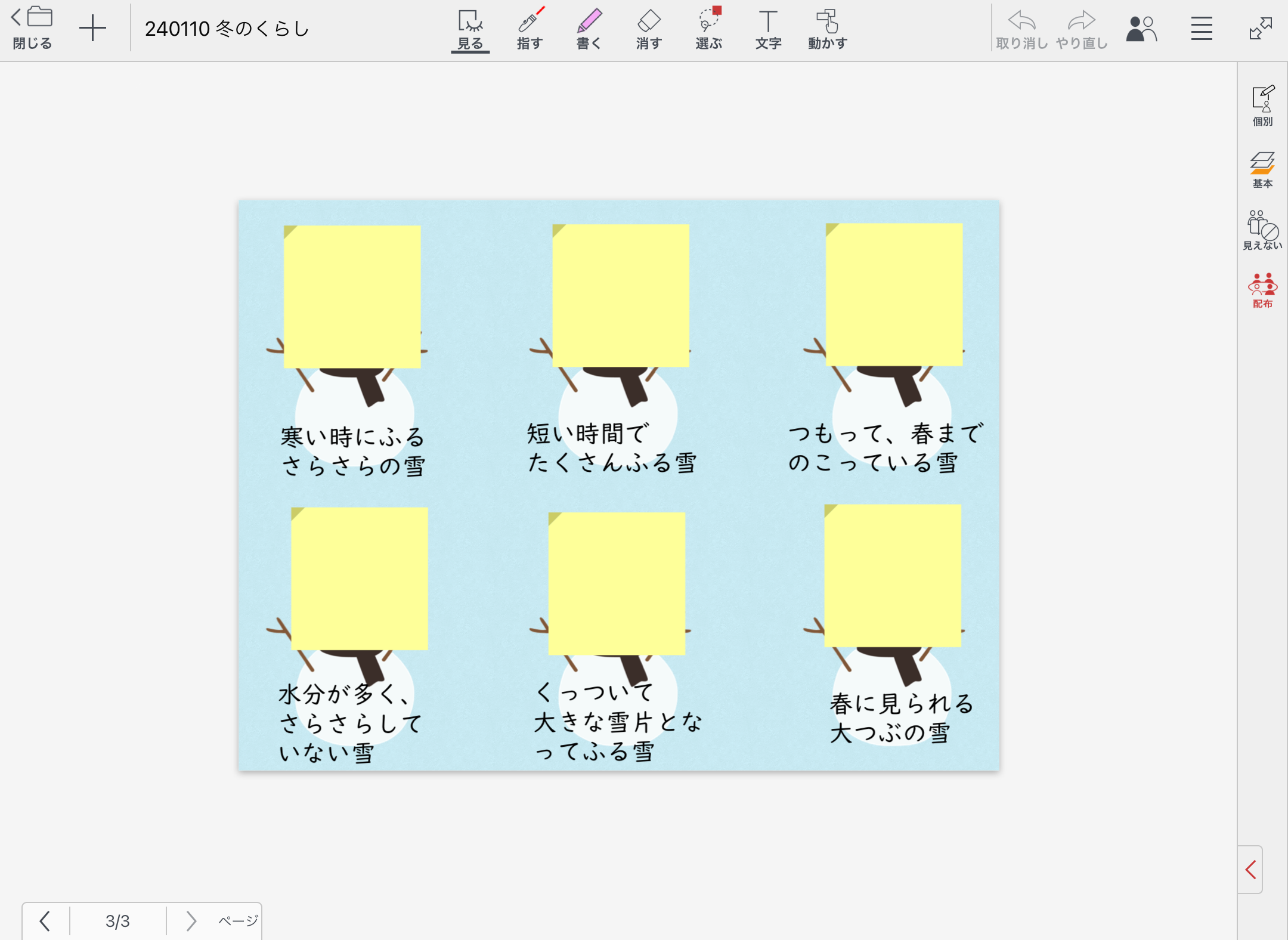 東京都、埼玉県在住がほとんどの本校児童にとって雪は珍しい物であり、わずかでも降るだけで「わー!!」と一気に気分が高揚する場面が多い。そんな児童にとっては「何雪だろう」という考えに至らないことが多いです。そのため教科書の川崎洋さんの詩を読んだだけでは、その雪の状態をイメージすることはなかなかできないことが予想されます。そこで雪の説明と雪の呼び名を雪だるまで結び合わせる内容を検討しMetaMoJi ClassRoomで作成しました。基本レイヤーに雪だるまの胴体と雪の説明。個別レイヤーには雪だるまの頭に雪の呼び名をグループ化したものを配置。児童が考えながら雪だるまの頭を動かす内容で、授業にも動きが出てよかった。