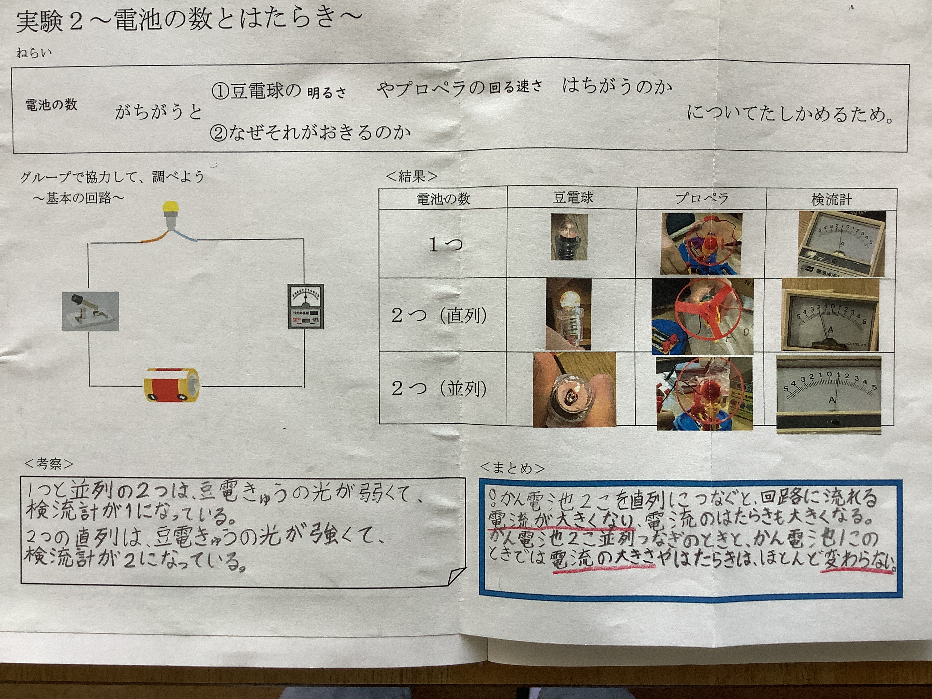 ①電池1つ ②電池2つ(直列) ③電池2つ(並列)について、豆電球、プロペラ、検流計の目盛りを撮影しよう。