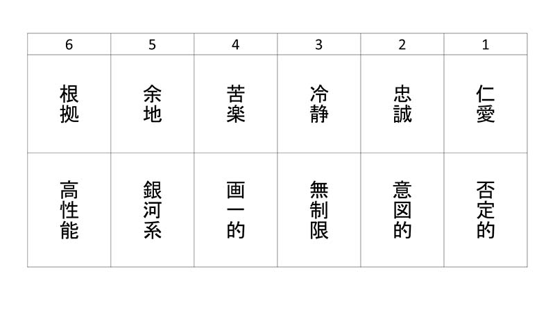 ・大きなスクリーンにサイコロの目に対応する語句の表を提示して(右上の画像)、デモンストレーションを見ながら、ゲームのルールを確認する。辞書や教科書、漢字ドリルなども自由に参考にしていいと伝える。