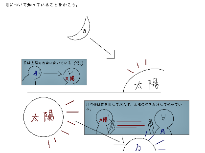 月と太陽の位置に着目して,これらの位置関係を多面的に調べる活動を通して,月の形の見え方と月と太陽の位置関係についての理解を図り,観察,実験などに関する技能を身に付けるとともに,主により妥当な考えをつくりだす力や主体的に問題解決しようとする態度を育成する。