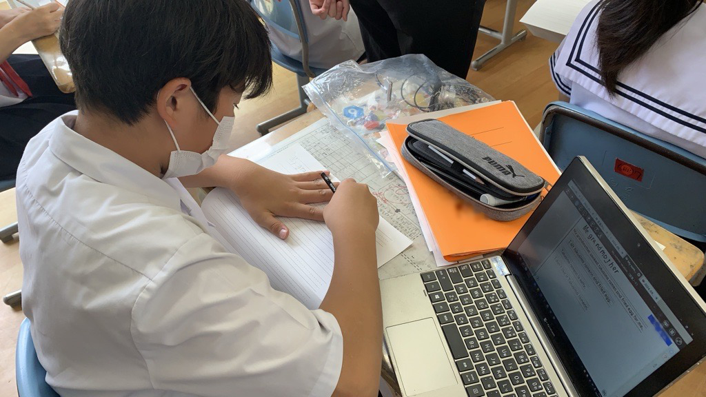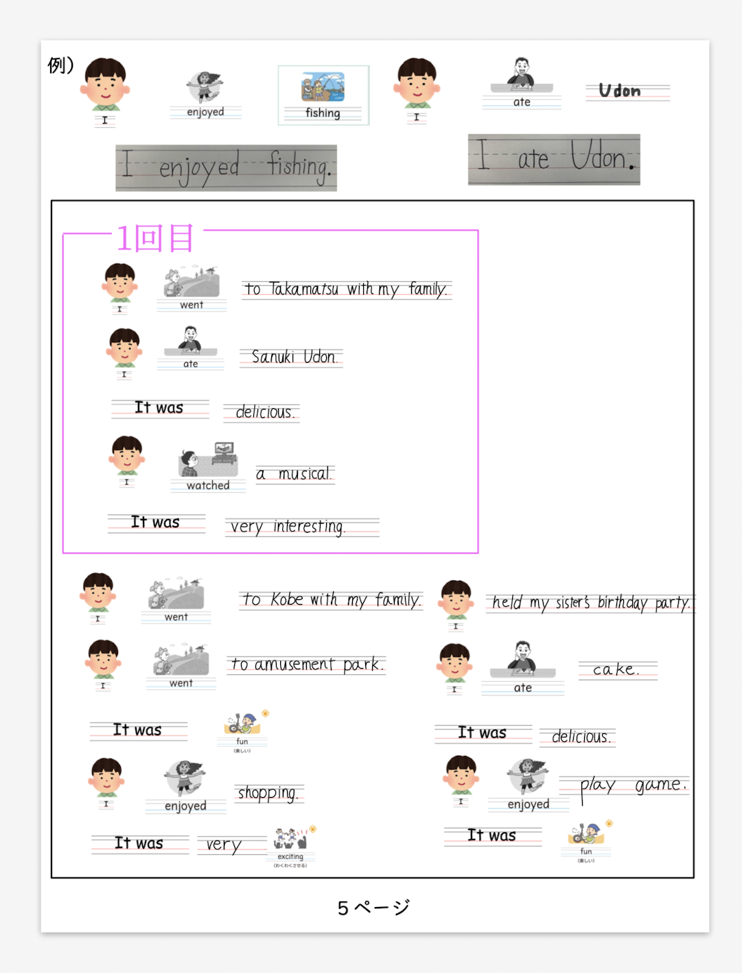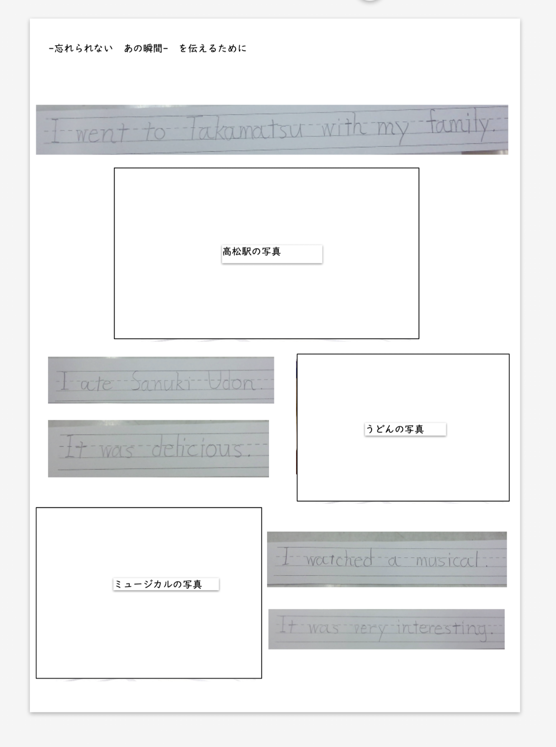 ◯友達やALTの先生に-忘れられないあの瞬間-を知ってもらうために、夏休みの思い出について、例文を参考に十分慣れ親しんだ簡単な語句や基本的な表現を用いて書くことができる。(書くこと)