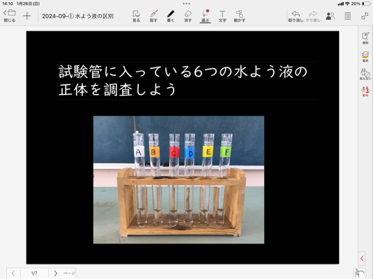 1.「試験管に入っている6つの水溶液の正体を調査する」という課題を知る。