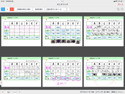 ・教師は、モニタリング画面を通じて、児童一人ひとりの学習状況や記録内容をリアルタイムで確認することができた。
