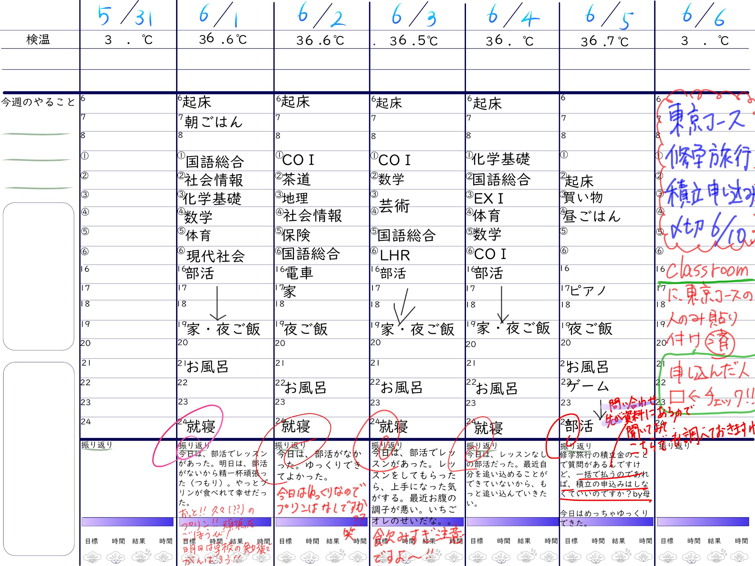 コロナ禍で検温を日々記録するや時間割変更、各種提出物の提出期限をメモするなどできる。