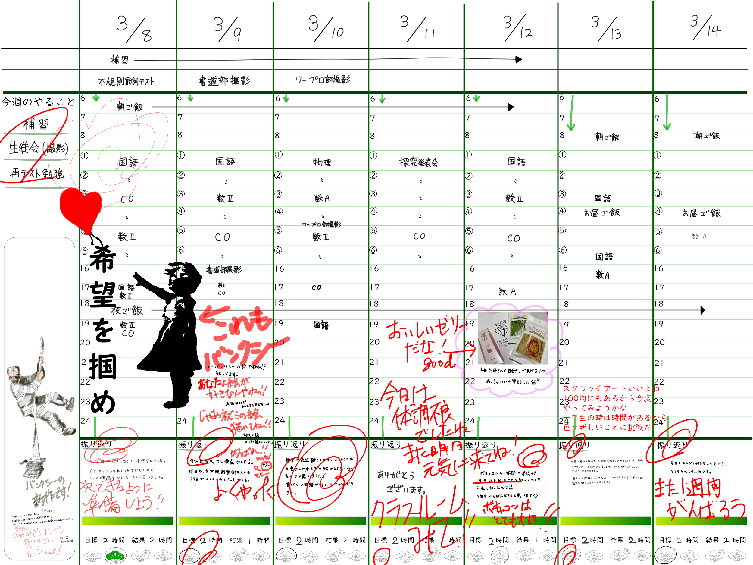 昨年度、新1年生への導入へ向け実施していたシートである。若干検温の記入欄などがないがMetaMoJiの特徴である【画像を挿入できる】や【細かいイラストを描くことができる】などを活用している事例である。紙の手帳ではできないようなコミュニケーションを生徒と取ることができ、宿題でわからなかった数学の問題などを画像として貼り付け、助言を求める生徒もいた。