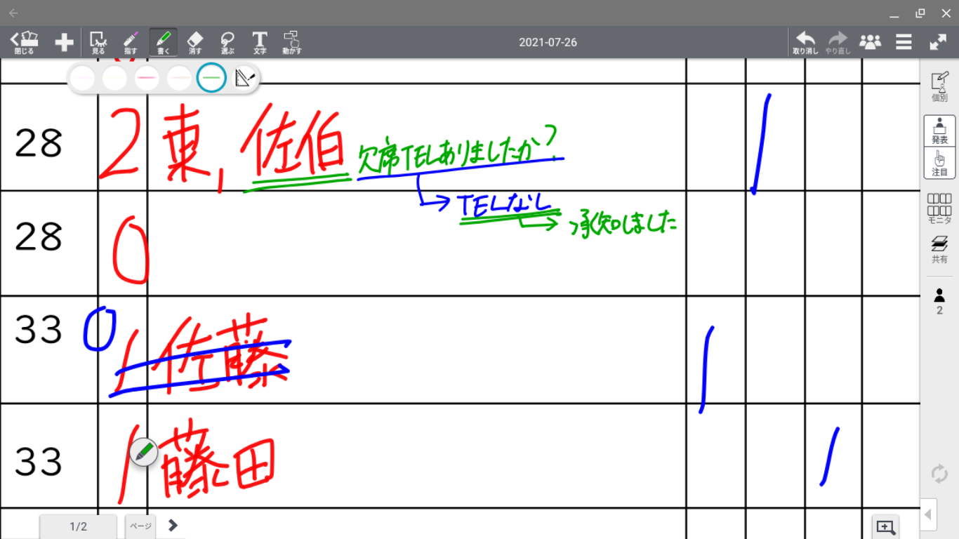 ICT機器の利用が不得意であっても今まで通りの出欠黒板の形式をMetaMoJi上で再現したことで簡単に記入できる。