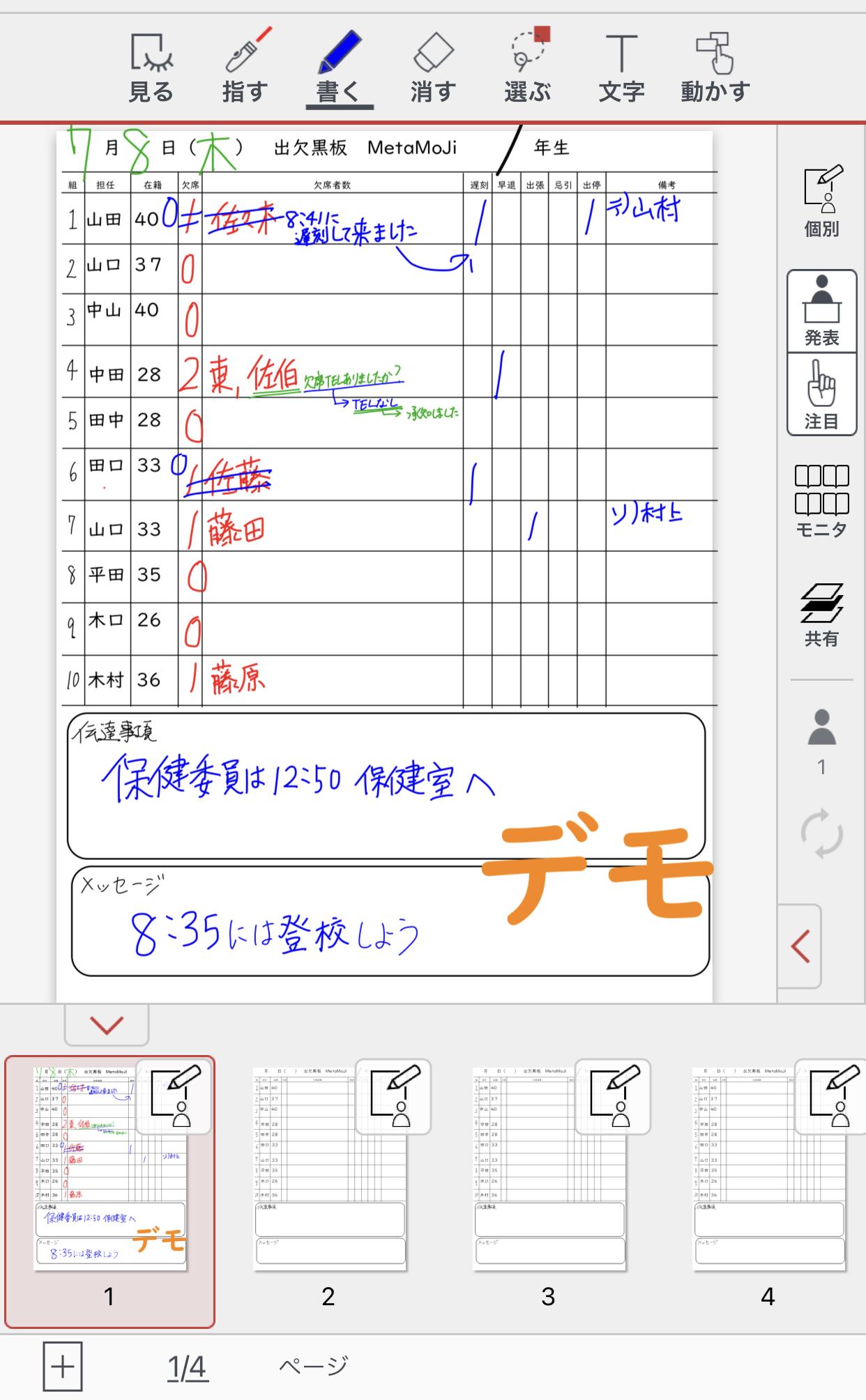 ※今回紹介するために掲載したMetaMoJi出欠黒板はデモ画面であり実際の生徒名や出欠状況ではありません。