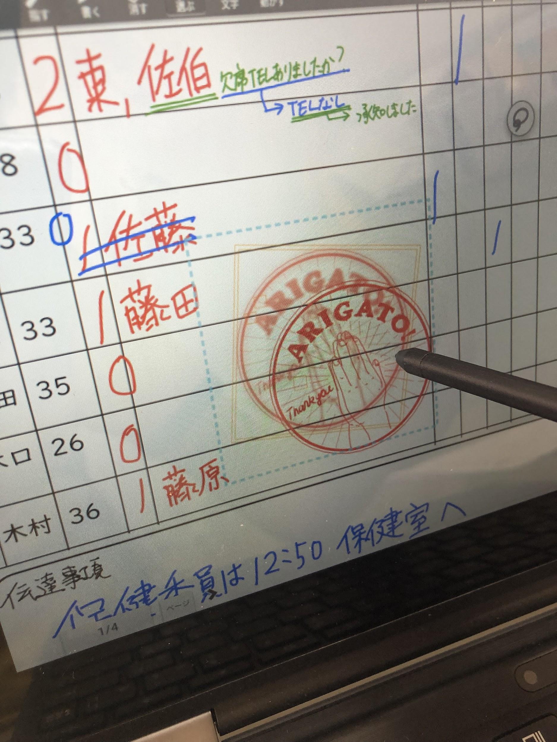 今までは主任•副担任が未記入のクラスがないか実際の出欠黒板まで行き、書いてないクラスがあれば担任へ声掛けをしていた。担任が不在だと探して記入するよう声を掛けを行っていた。それがMetaMoJi上にまとめられているので一目で未記入のクラスを確認でき、すぐに担任に声を掛けることができるようになった。