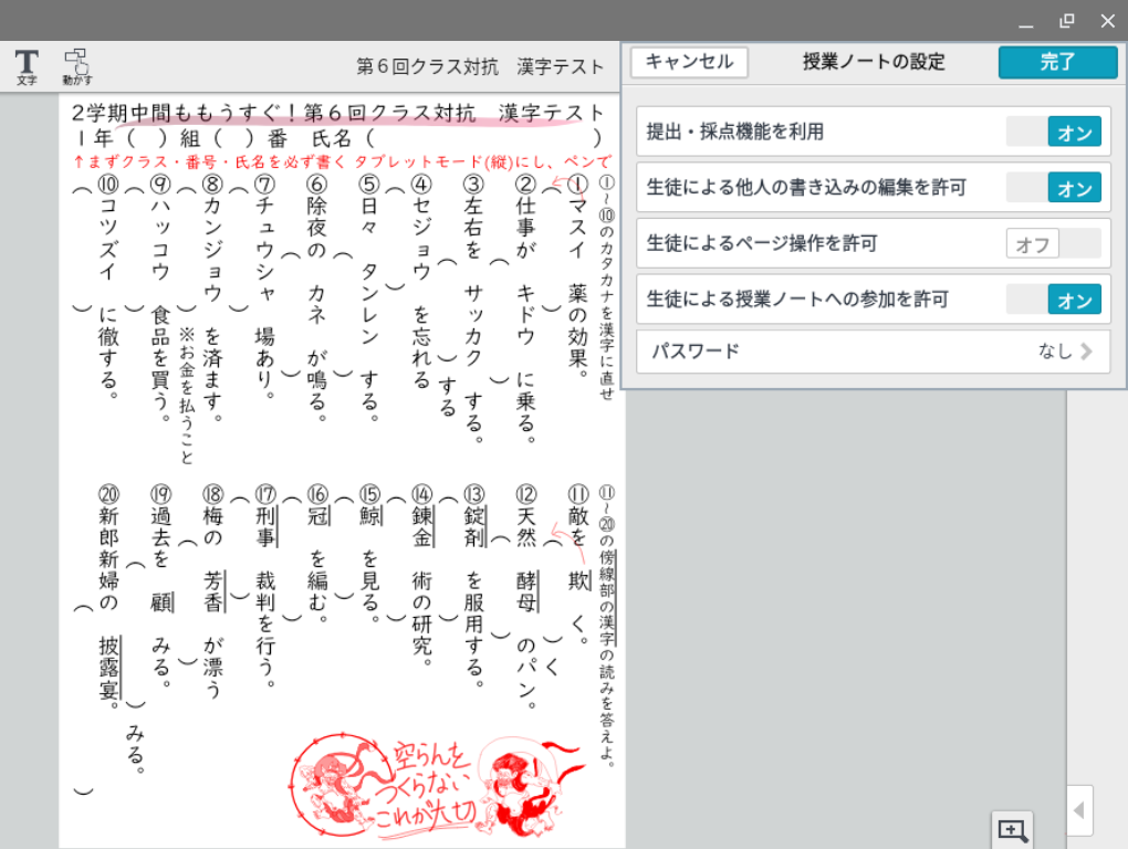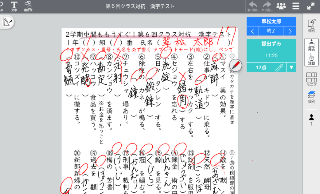 クラス対抗漢字テストの作成、配布。現在270名を越える生徒を1つのクラスボックス〈全ー1年生〉で管理しており、MetaMoJi ClassRoomで作成した漢字テストを一括で配布できる。テストモードに設定し、生徒は解答後【提出する】ボタンで提出することができ、教員が提出状況をリアルタイムで把握できる。回収はMetaMoJi ClassRoom内でできるためペーパーレス、かつ回収・返却の手間がかからない。