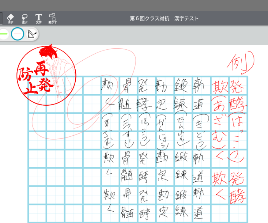 ②学年対抗漢字テストの作成、配布。現在270名を越える生徒を1つのクラスボックスで管理しており、MetaMoJi