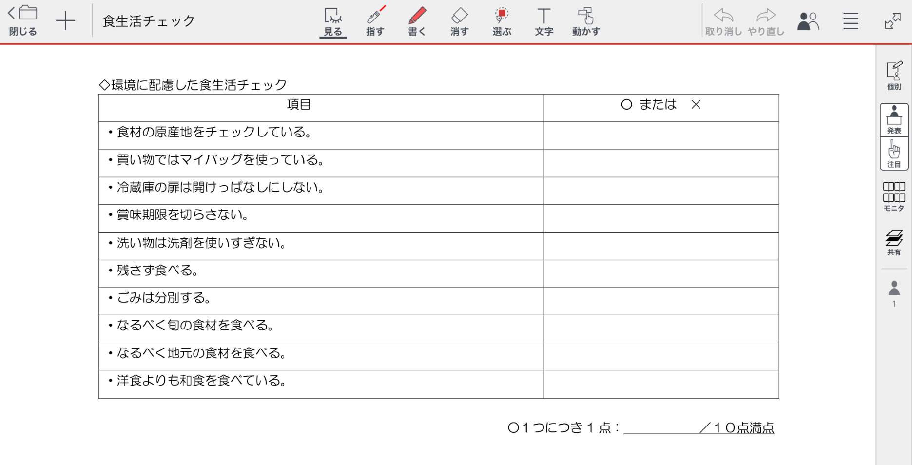 ・環境に配慮した食生活10項目に関して、○または×でチェックし、10点満点で採点した。