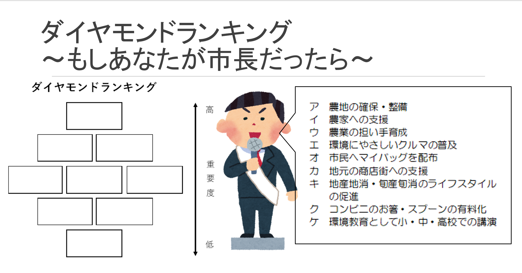 ・環境問題を考えていく上で、個人レベルの取り組みだけでは限界があるだろう。そこで、もう一つ大きな視点から環境問題を考えるために、「ダイヤモンドランキング~もしあなたが市長だったら~」を行い、9つの政策をランキング付けをした。