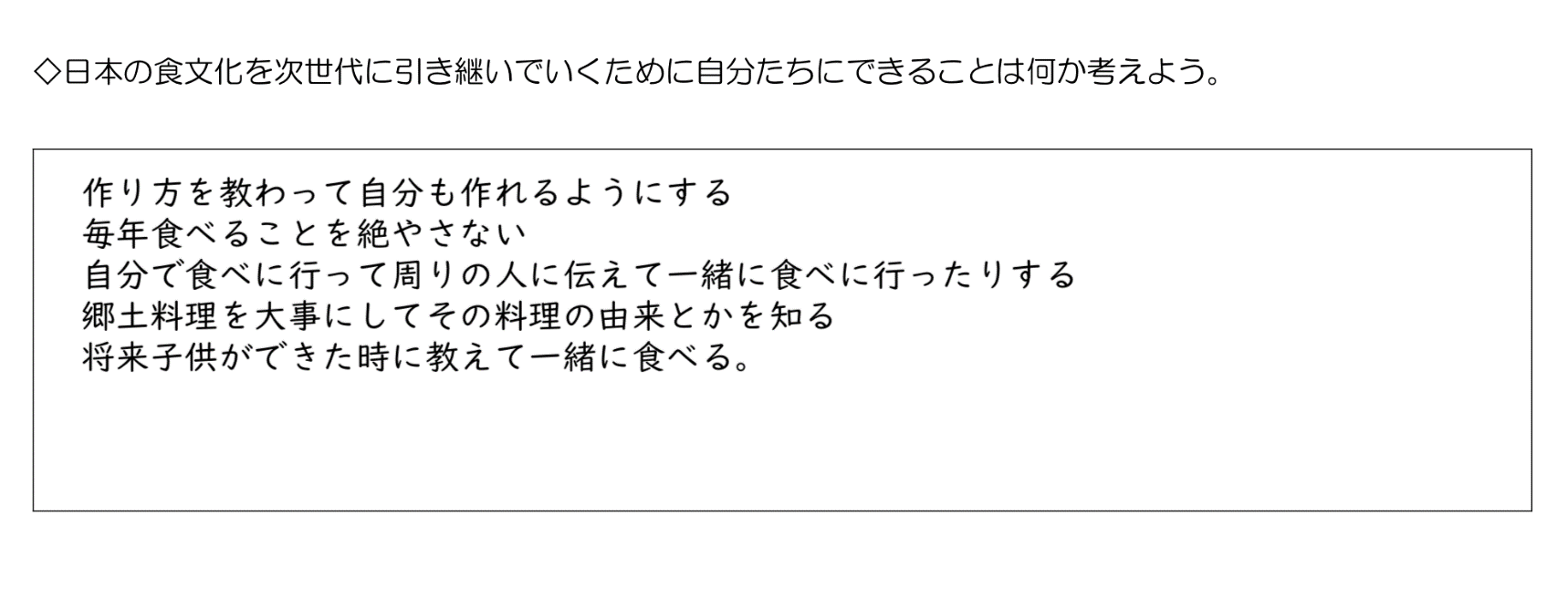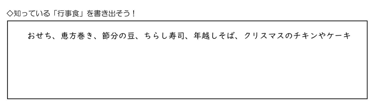 日本の行事食や郷土料理について関心をもち、日本の食文化を伝承するために大切なことを考えることができる。