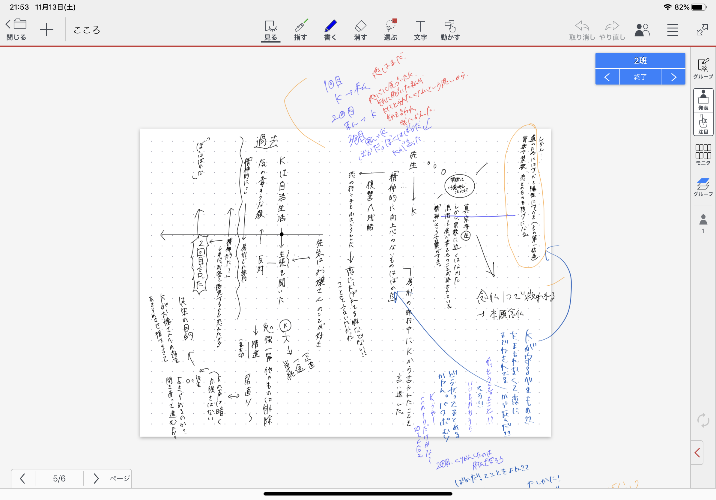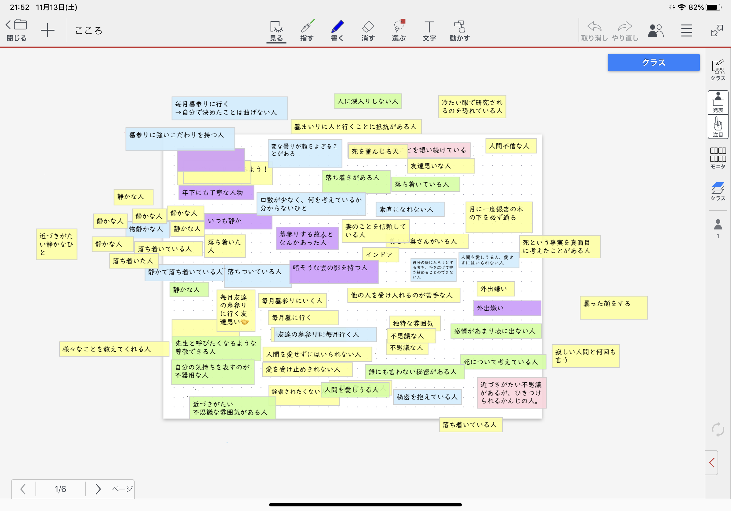 上編(教科書掲載部に限る)を読み、先生の人柄が窺える箇所を個人ページに列挙させた。その後、クラス学習ページ(添付写真)に自身の読みを付箋に記入させ、同じような内容については、近い位置に移動させ、まとめさせた。
