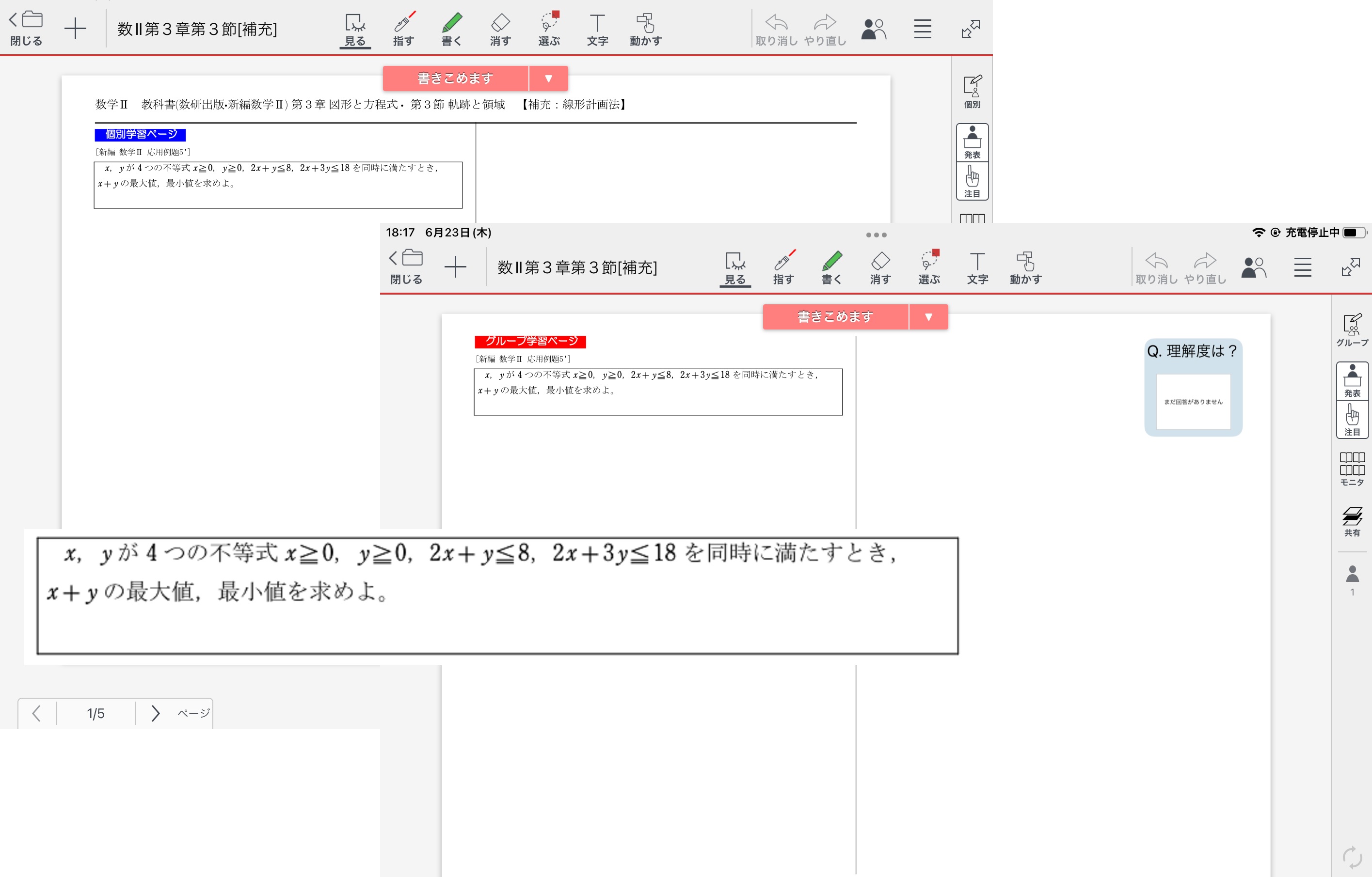 同じ問題を1ページ目「個別学習ページ」、2ページ目「グループ学習ページ」に設定して配布。最初の数分はまず自分で考え(思考錯誤して)、その後グループ学習としたが、個人の思考の過程を残せるように配慮した。