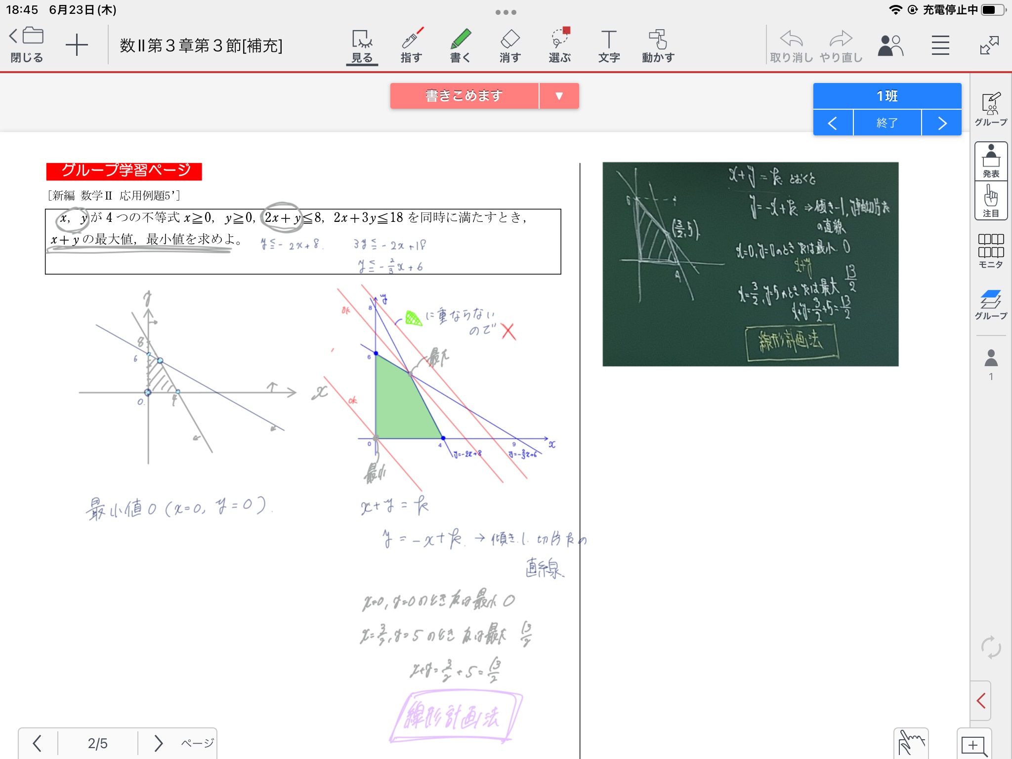 その後、「x+y=kとおく」というヒントのみを与えたが、そのヒントを元に、自分たちの描いたグラフで直線を平行移動したりして考察を行っていた。