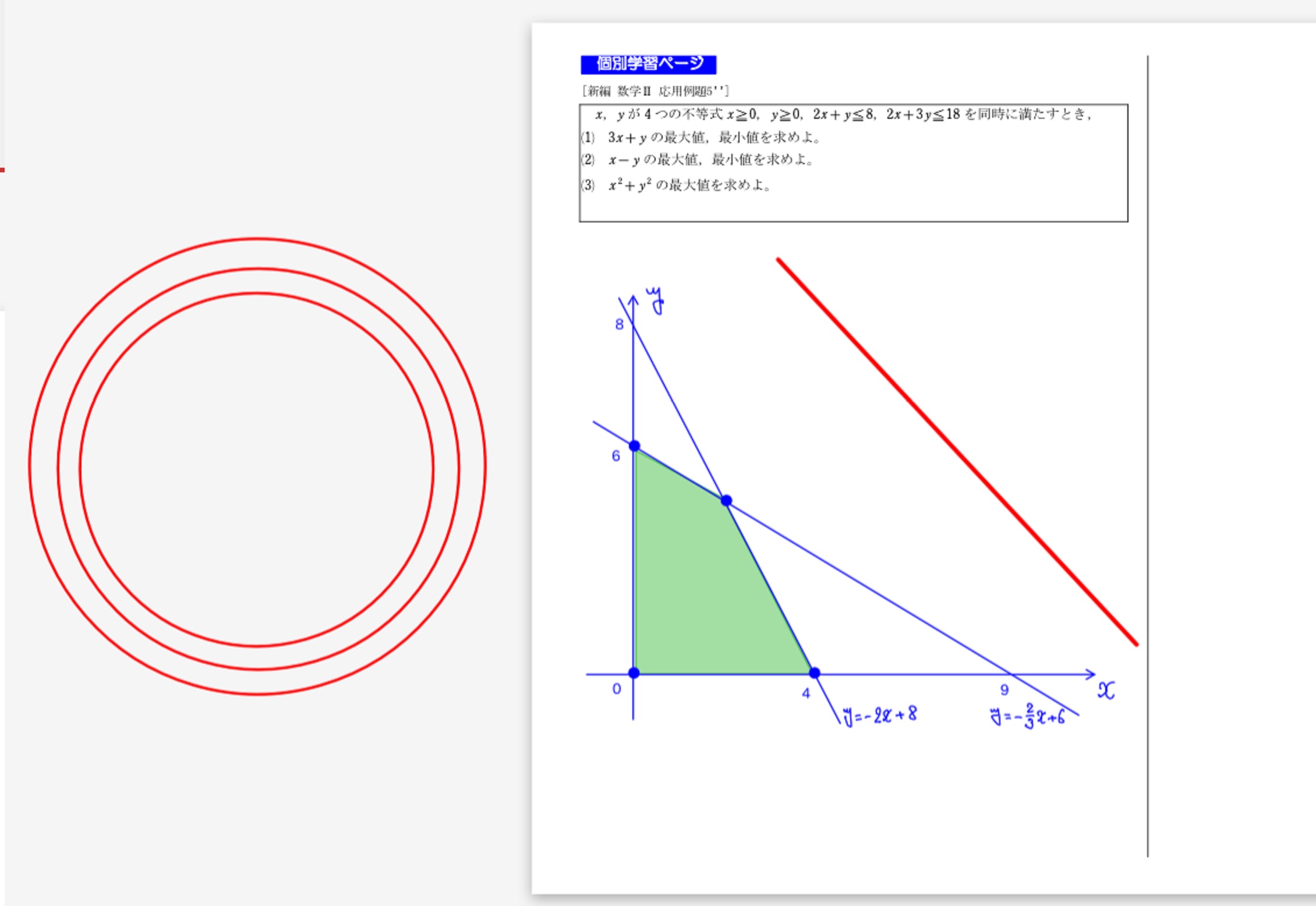 x,yが2つの不等式x≧0、y≧0、2x+y≦0、2x+3y≦18を同時に満たすとき、x+yの最大値・最小値を求めよ。