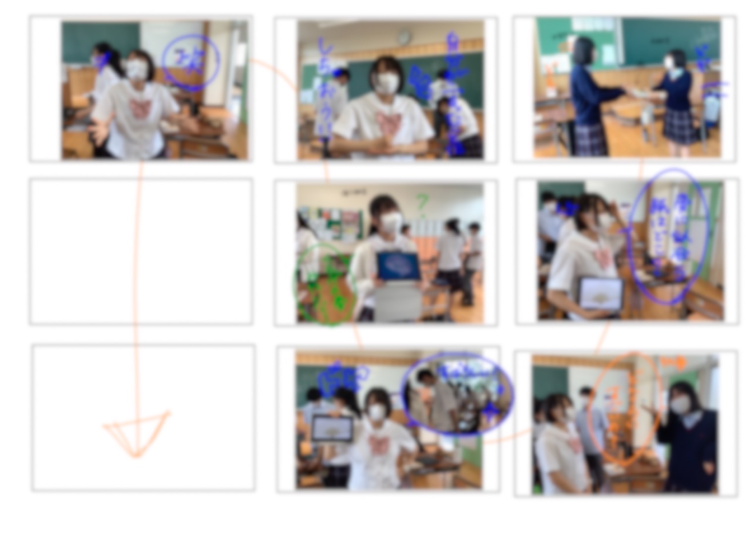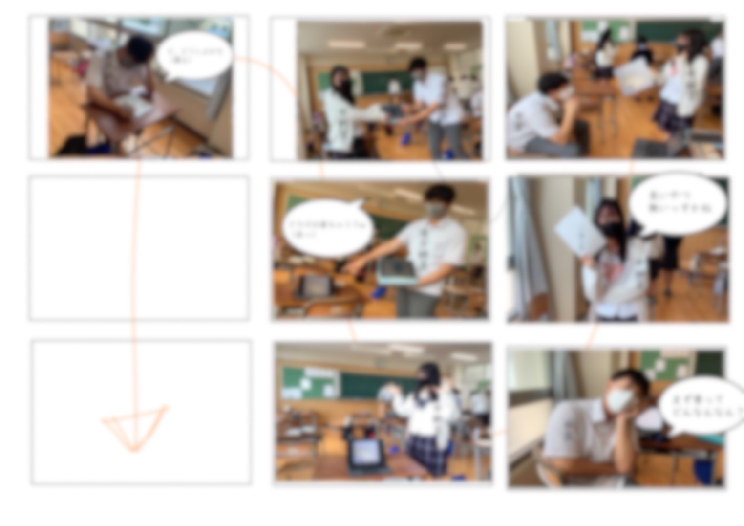 生徒を3~4人のグループに分かれ、作品の内容が分かる実写の〇コマ漫画を作成させる。また撮影した画像にセリフや補足事項を書き込みさせる。これらの活動は会話の話し手、聞き手や動作主、動作の受け手を視覚的に理解・表現することを目指す。
