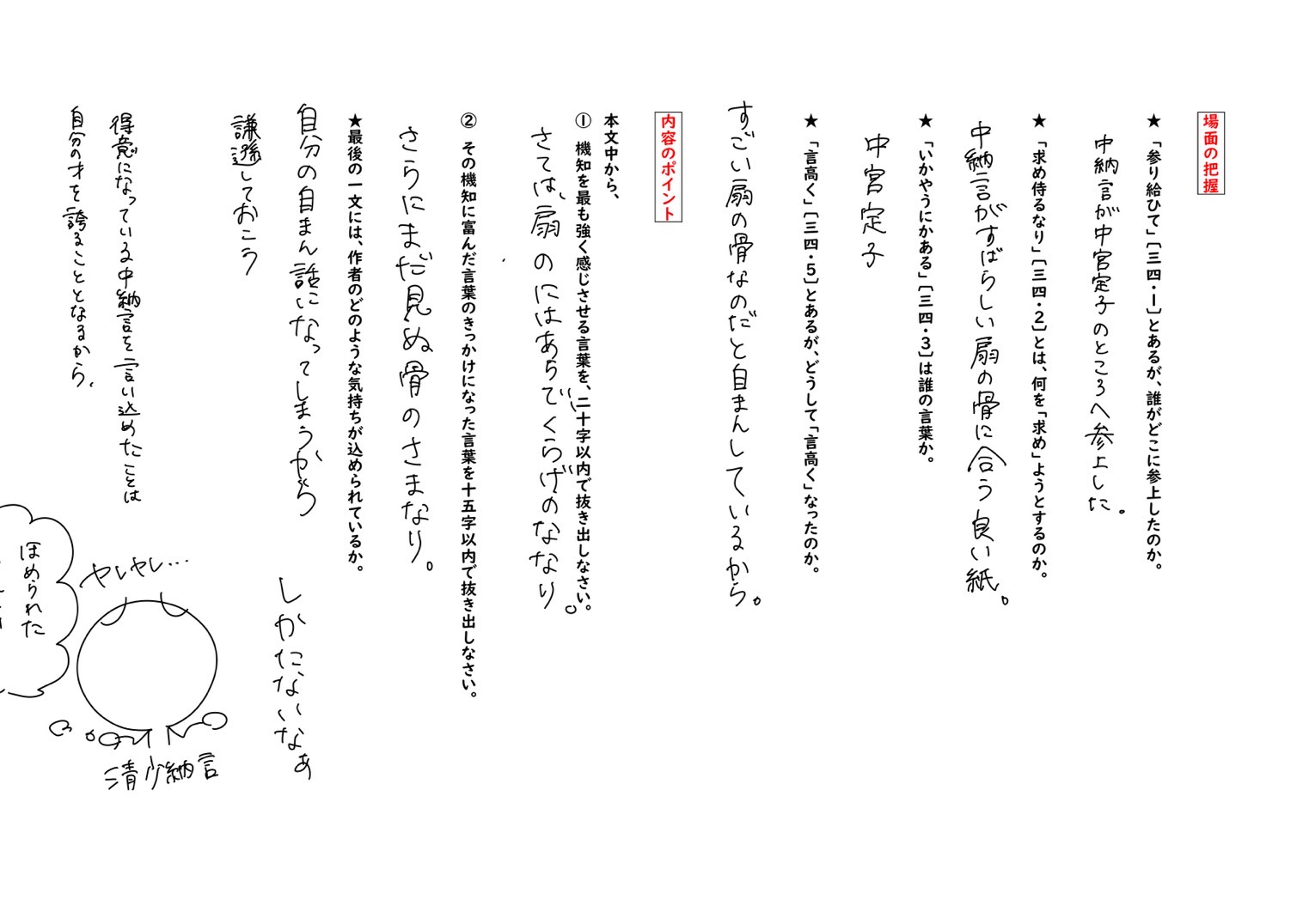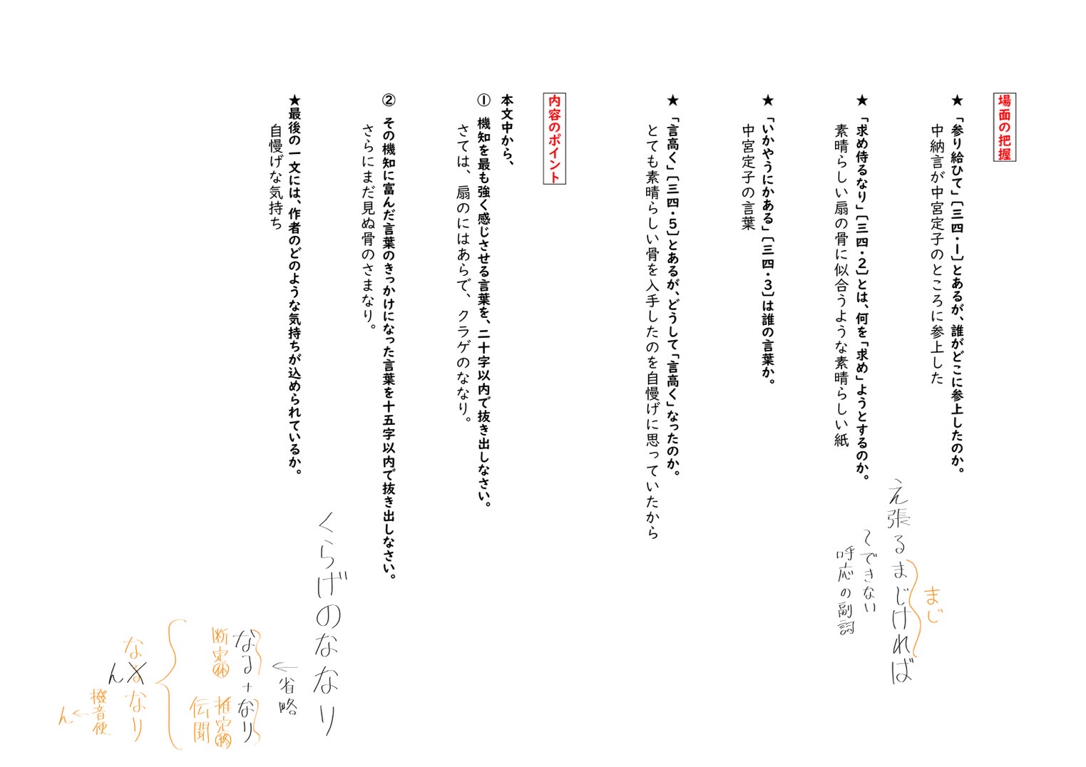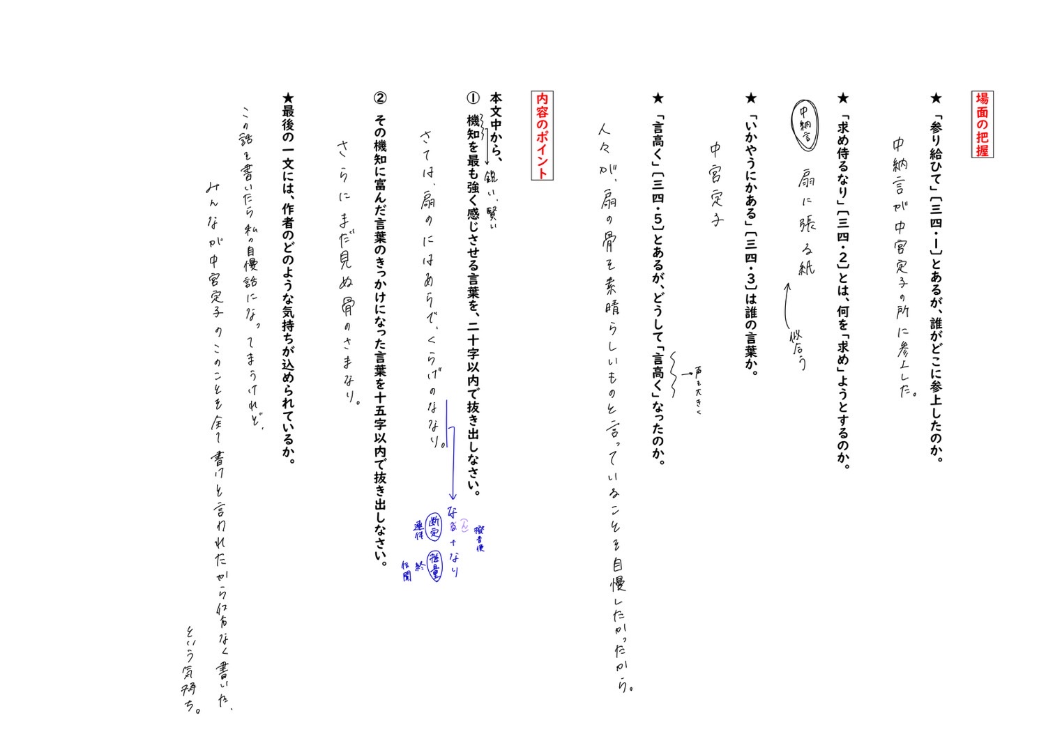 「語彙に注意したい古語」「助動詞」などの分かるようにした本文を先に配布することにより授業準備の負担軽減、また生徒が各自予習しやすい環境づくり簡単にペンの色を変えることができるために生徒が書き込みしやすい