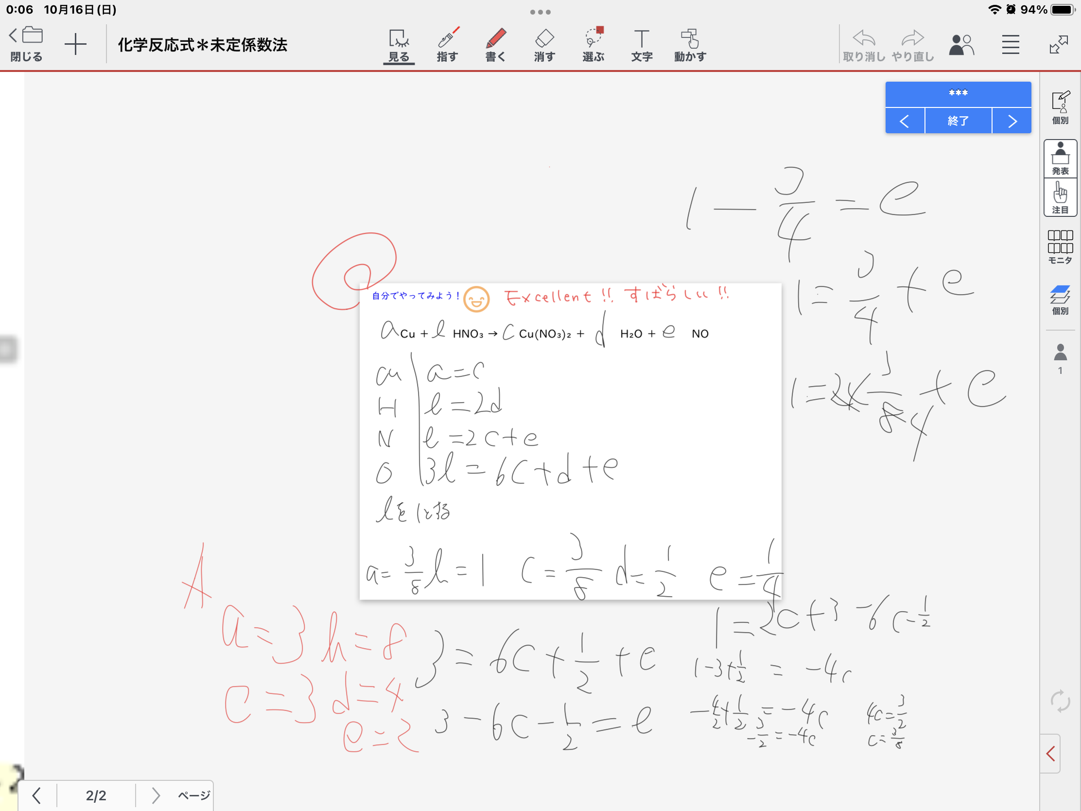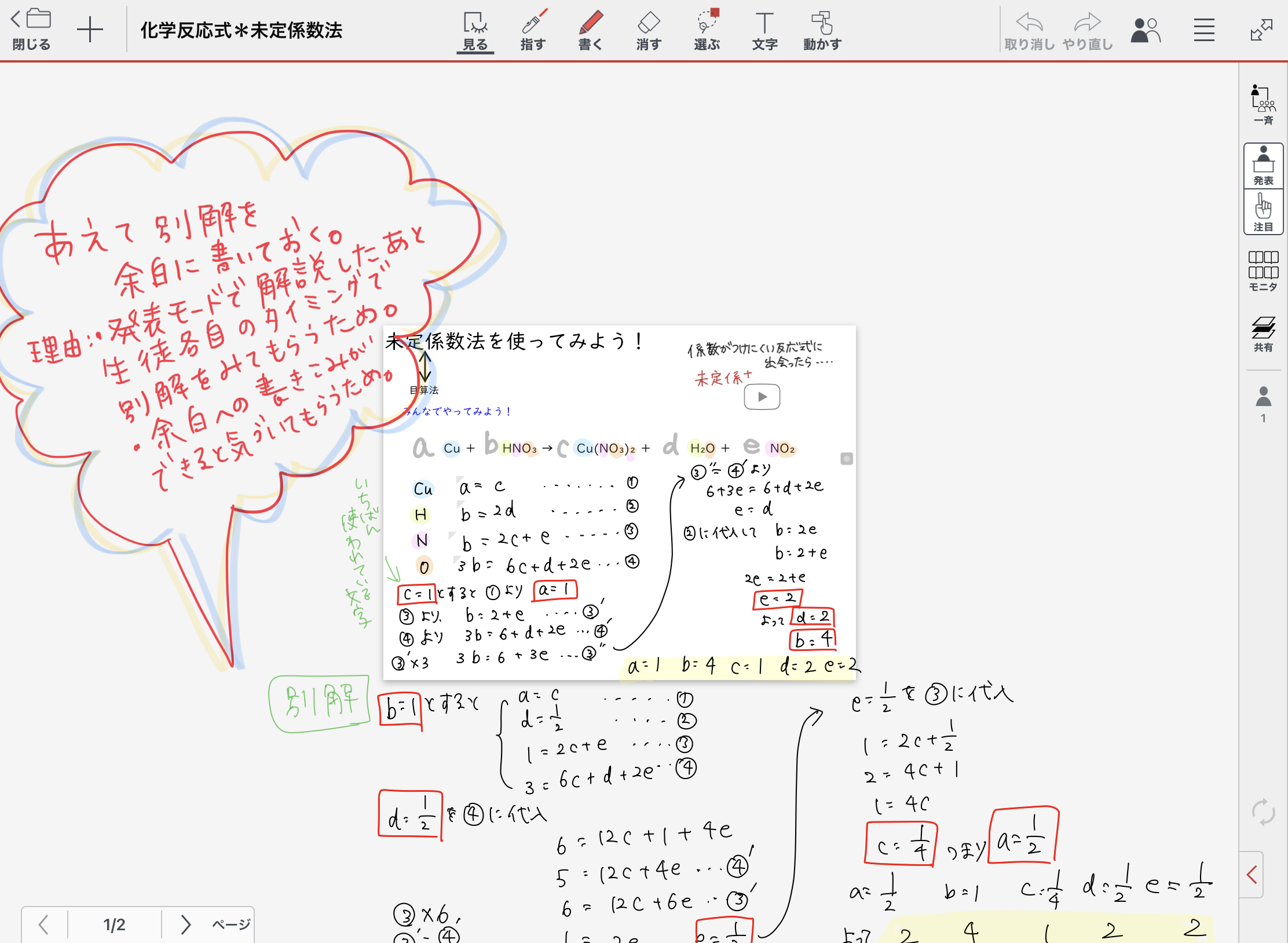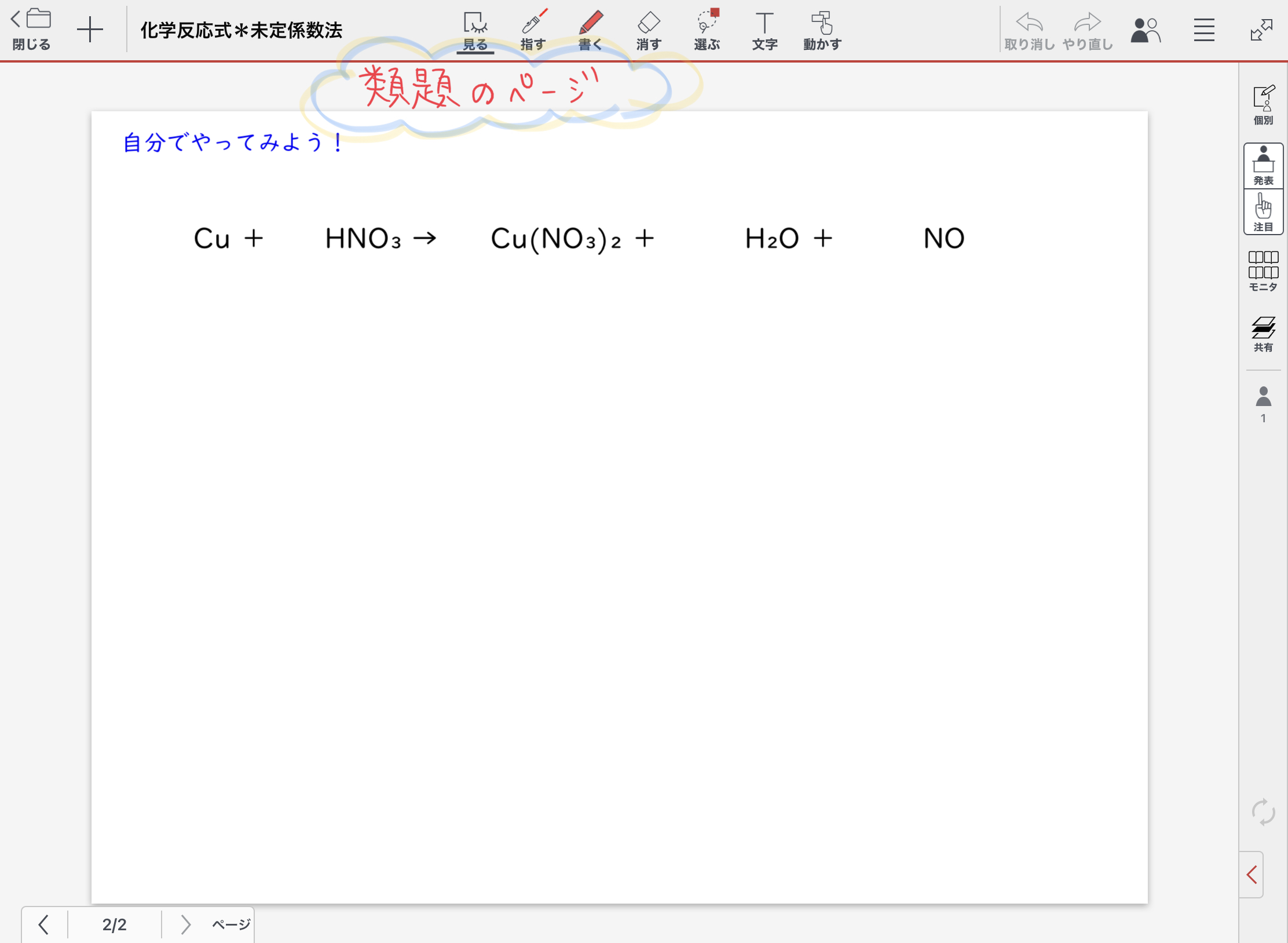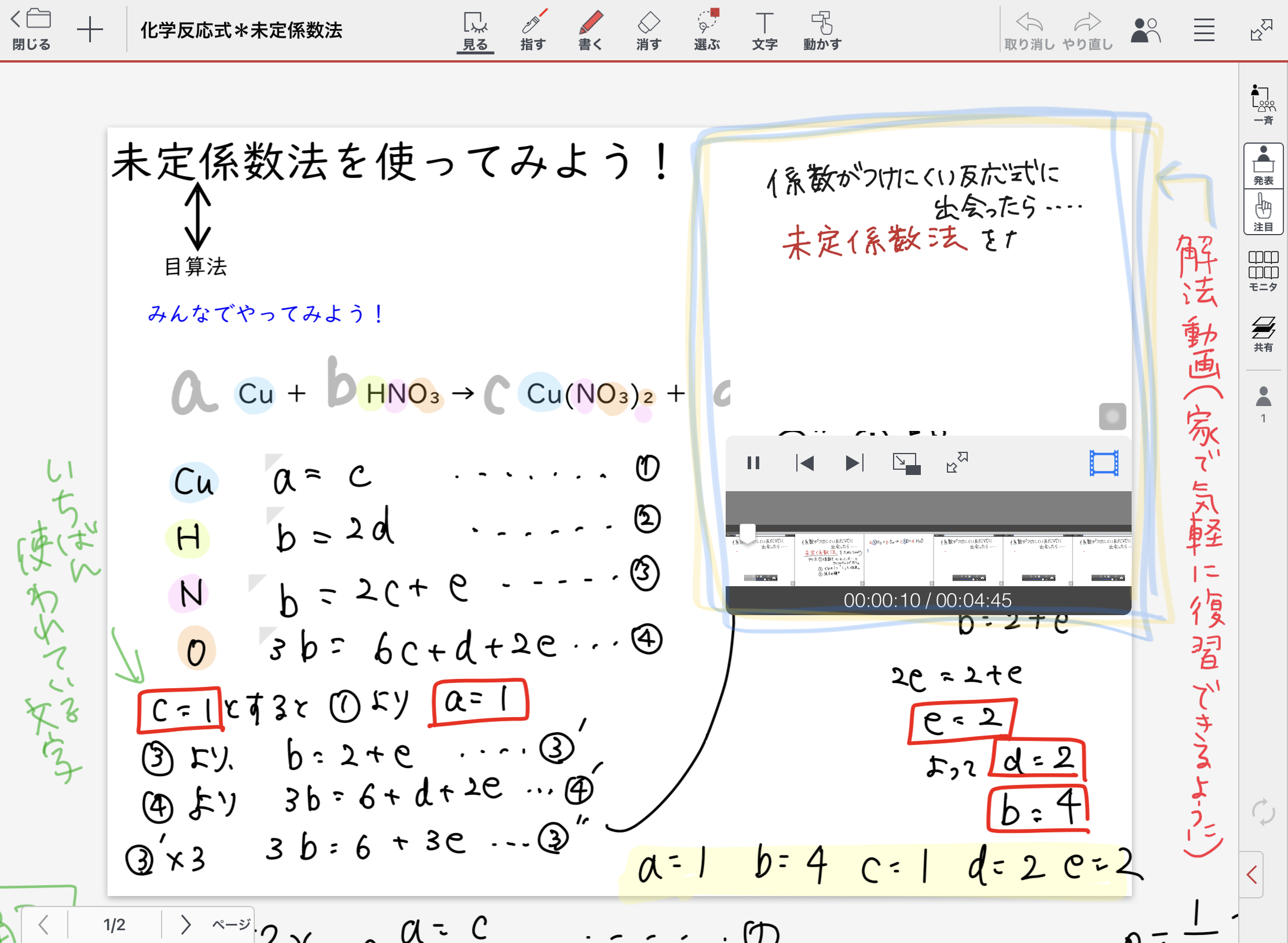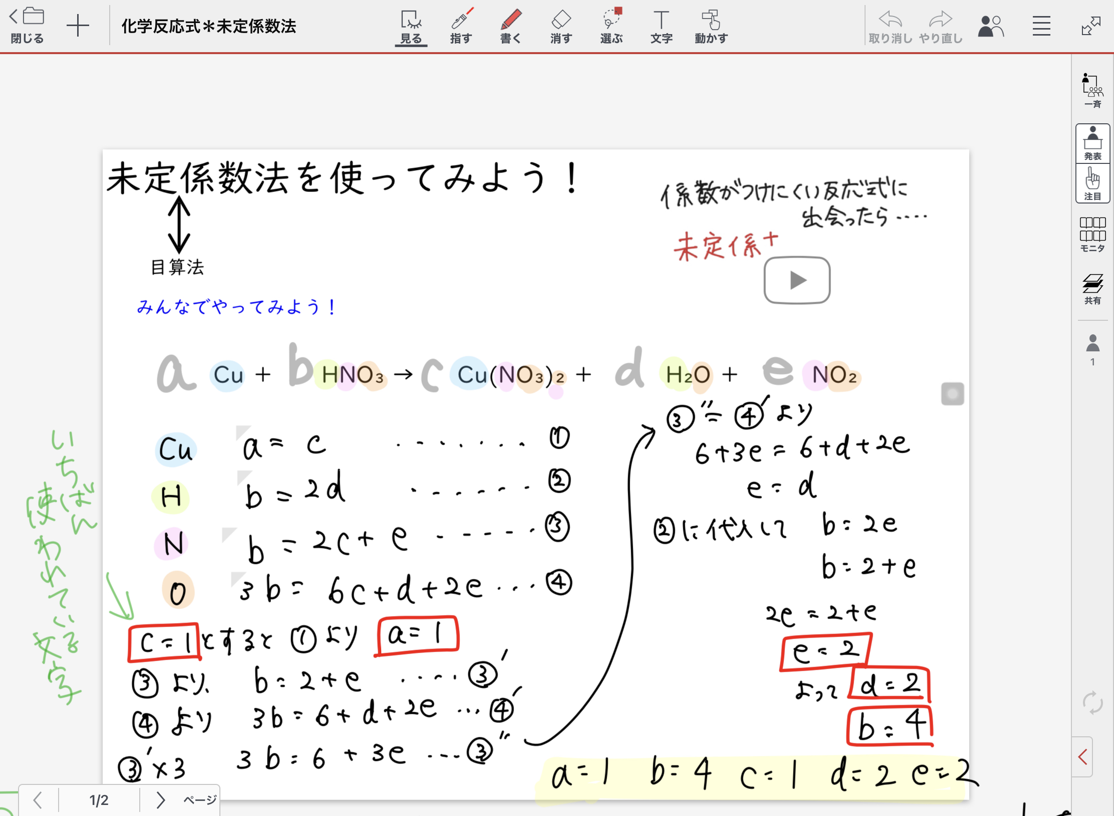 一斉学習ページで,教師が未定係数法を説明しながら化学反応式の係数をつける。