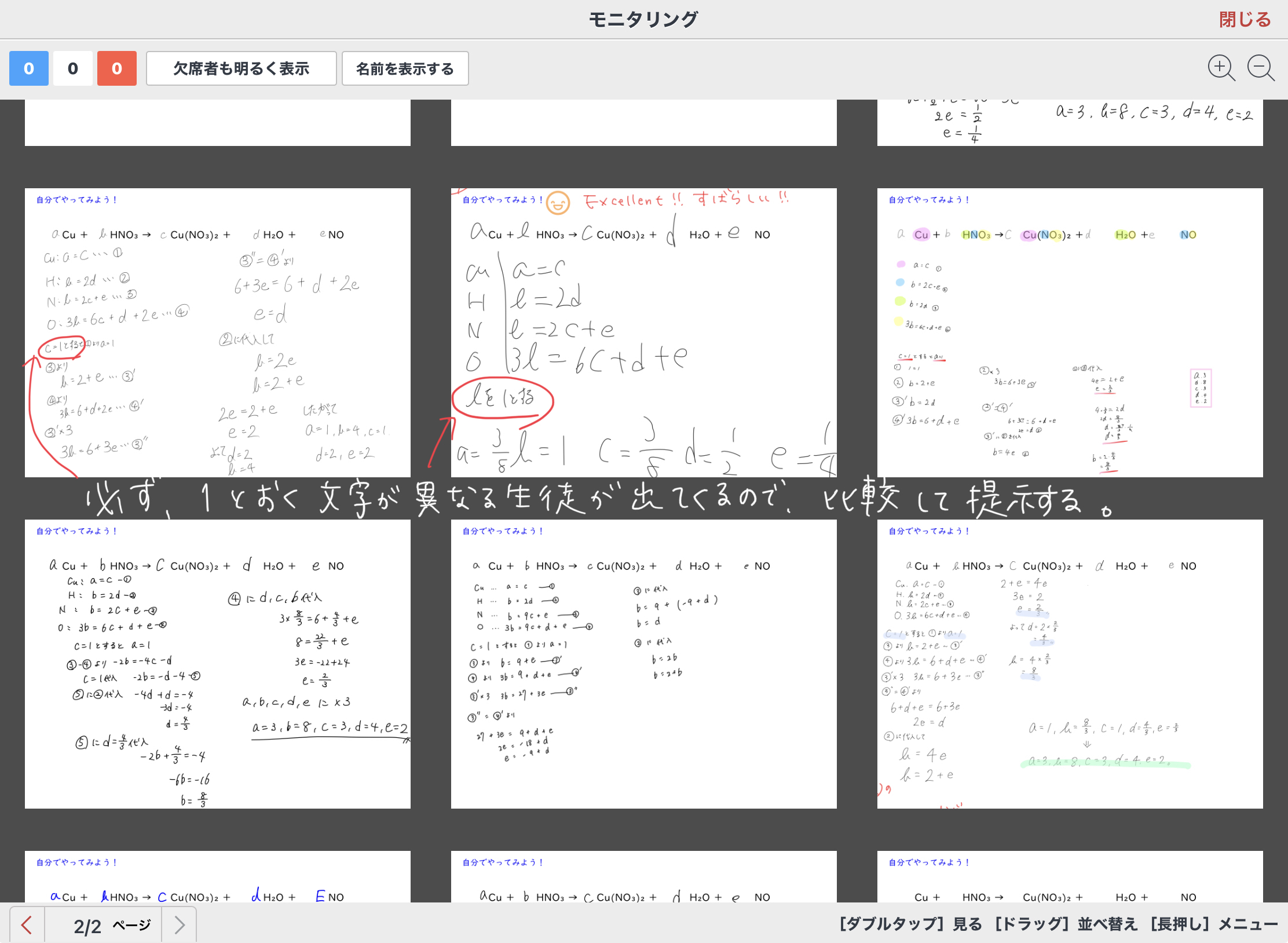 生徒が個別学習ページに書き込みを行なっている際,教師は生徒の解法をモニタリング画面で確認する。2の活動を通して,余白にも書き込みができると知った生徒も出てくるので,生徒の画面では余白への書き込みの有無も必ず確認する。