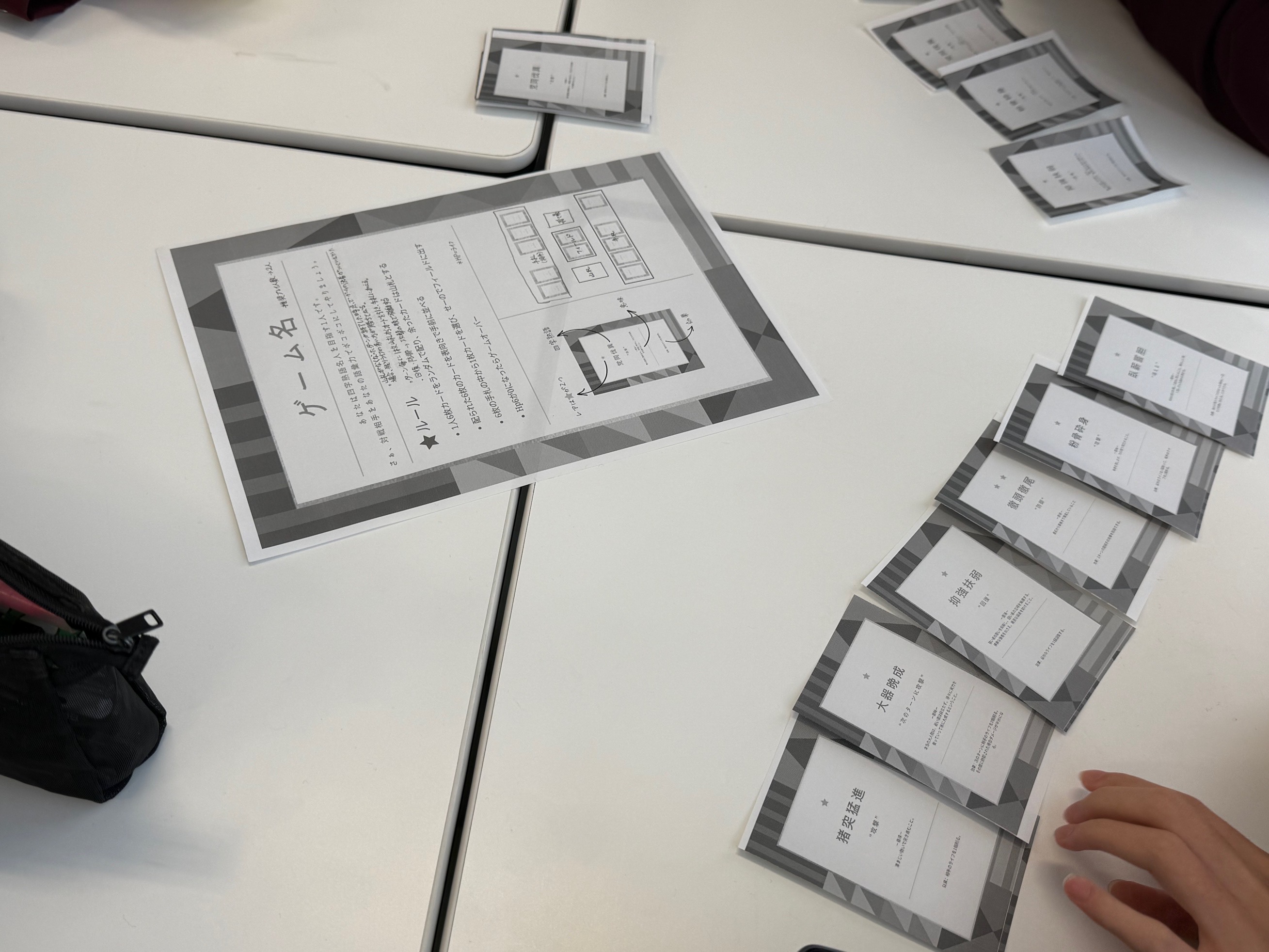 実際にゲームとルールの制作を開始しました。販売されているゲームのルールブックを参考にしたり、グループ内でテストプレイを繰り返したりしながら、約4コマで完成させました。一部のグループでは生成AIを活用し、カードに使用するイラストを作成する試みも行われました。
