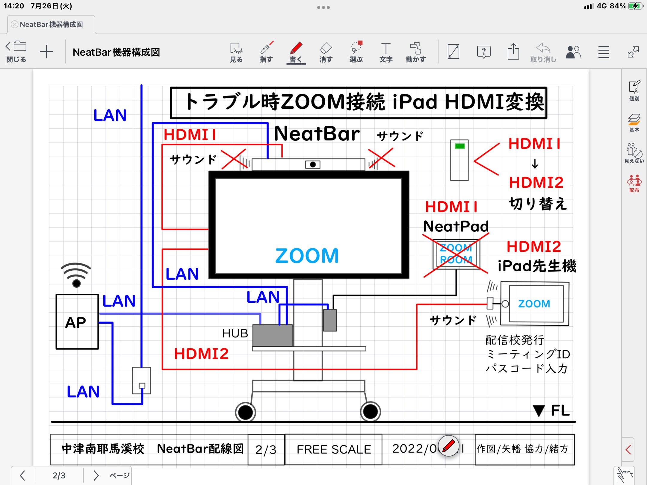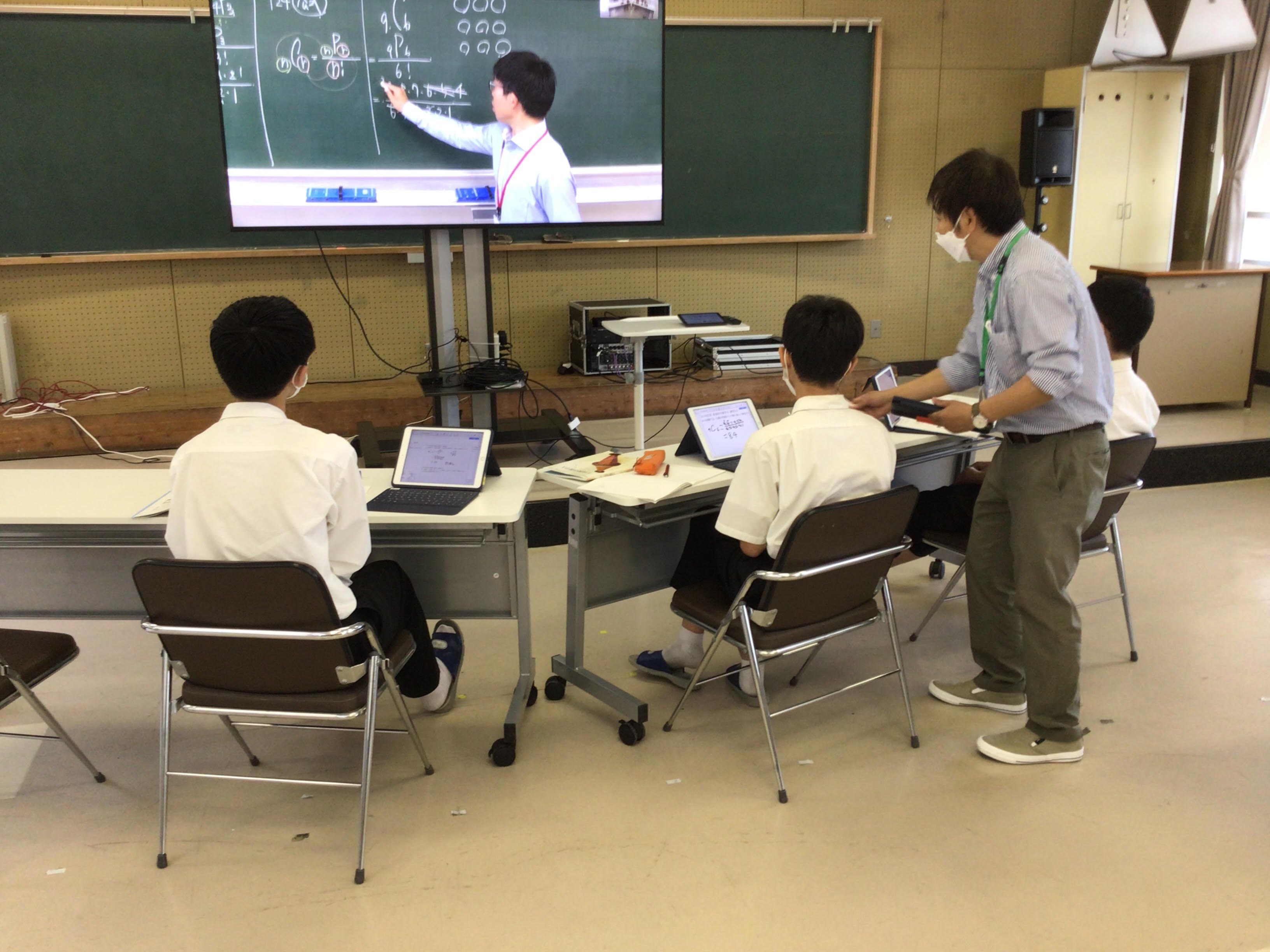 遠隔授業を実施する際のICT機器のハード面は、カメラ、マイク、スピーカーが一体となった横長の機器を大型ディスプレイ上部に設置し、ZOOMROOMの専用機器で簡単に接続ができるようになっています。ソフト面では、MetaMoJi ClassRoomを利用して配信校の先生が、リアルタイムで生徒と画面共有しながら授業を進めています。