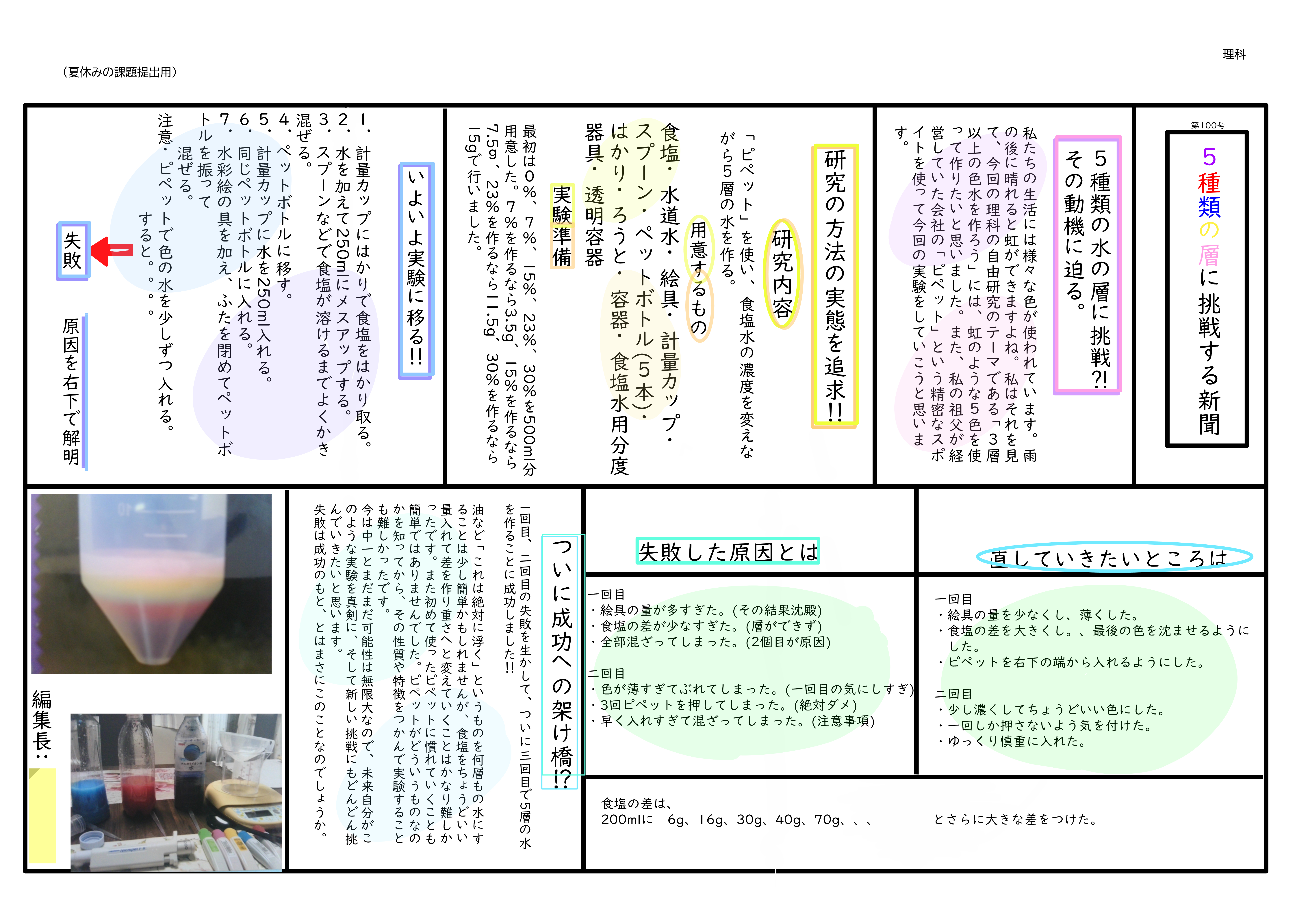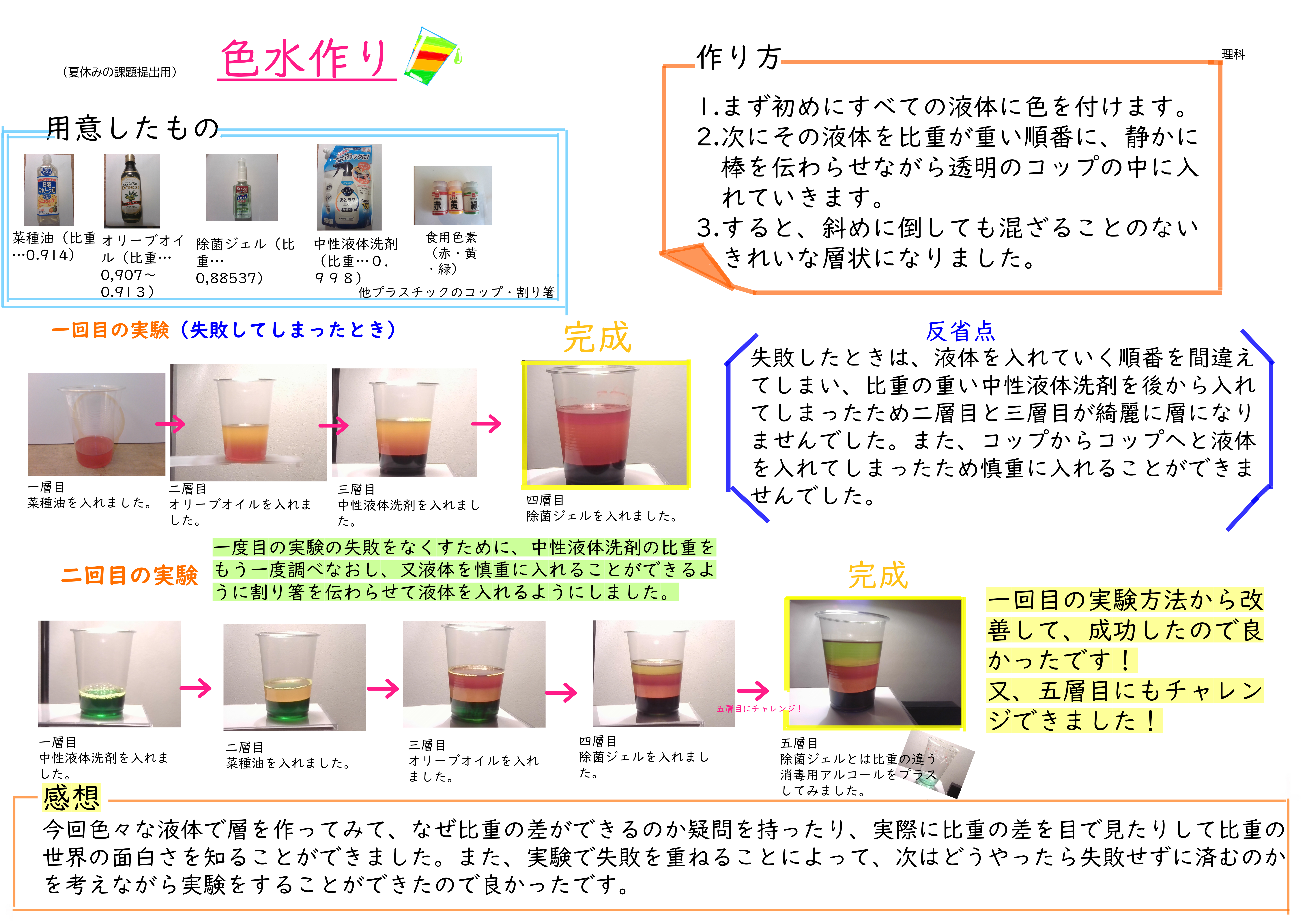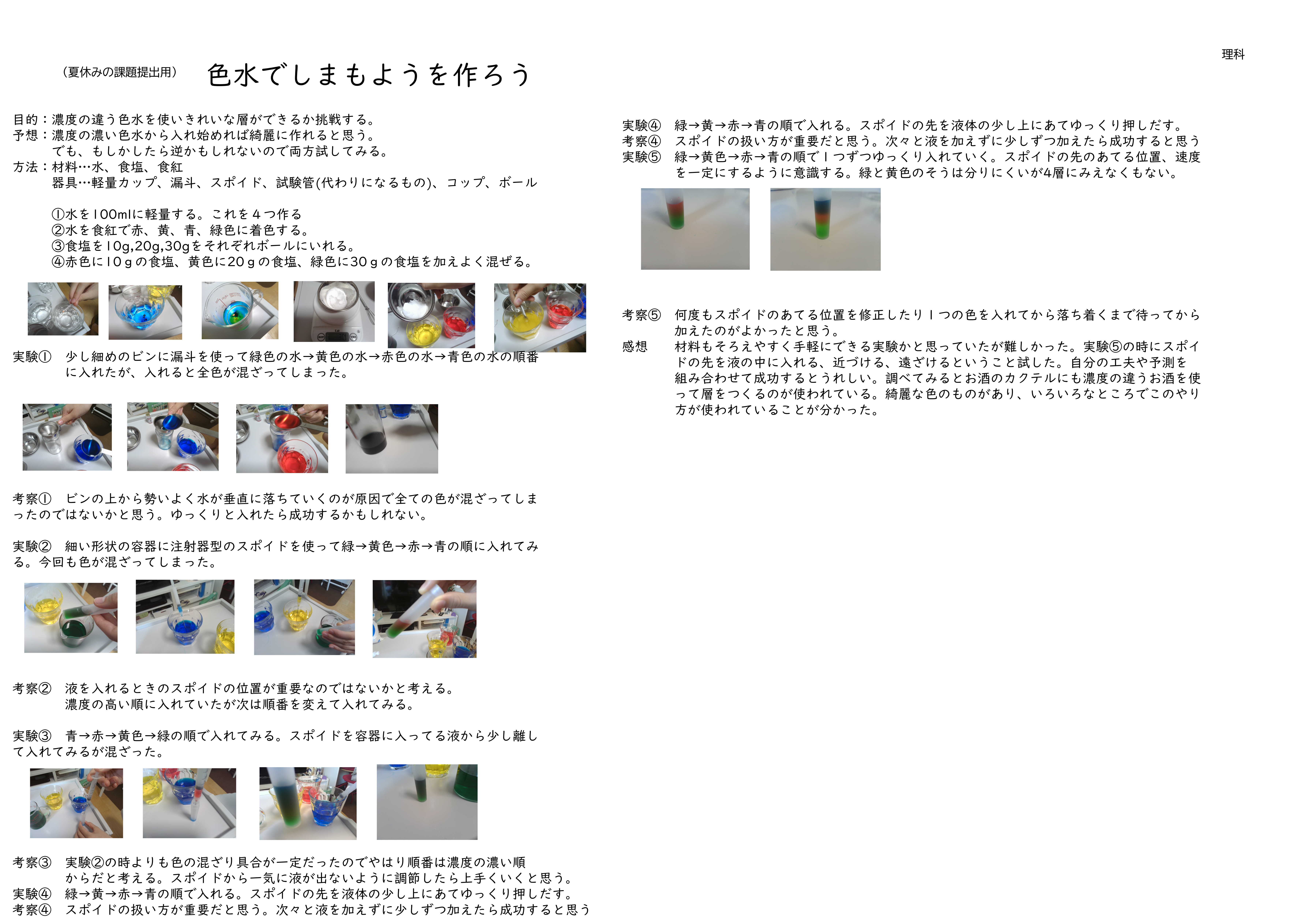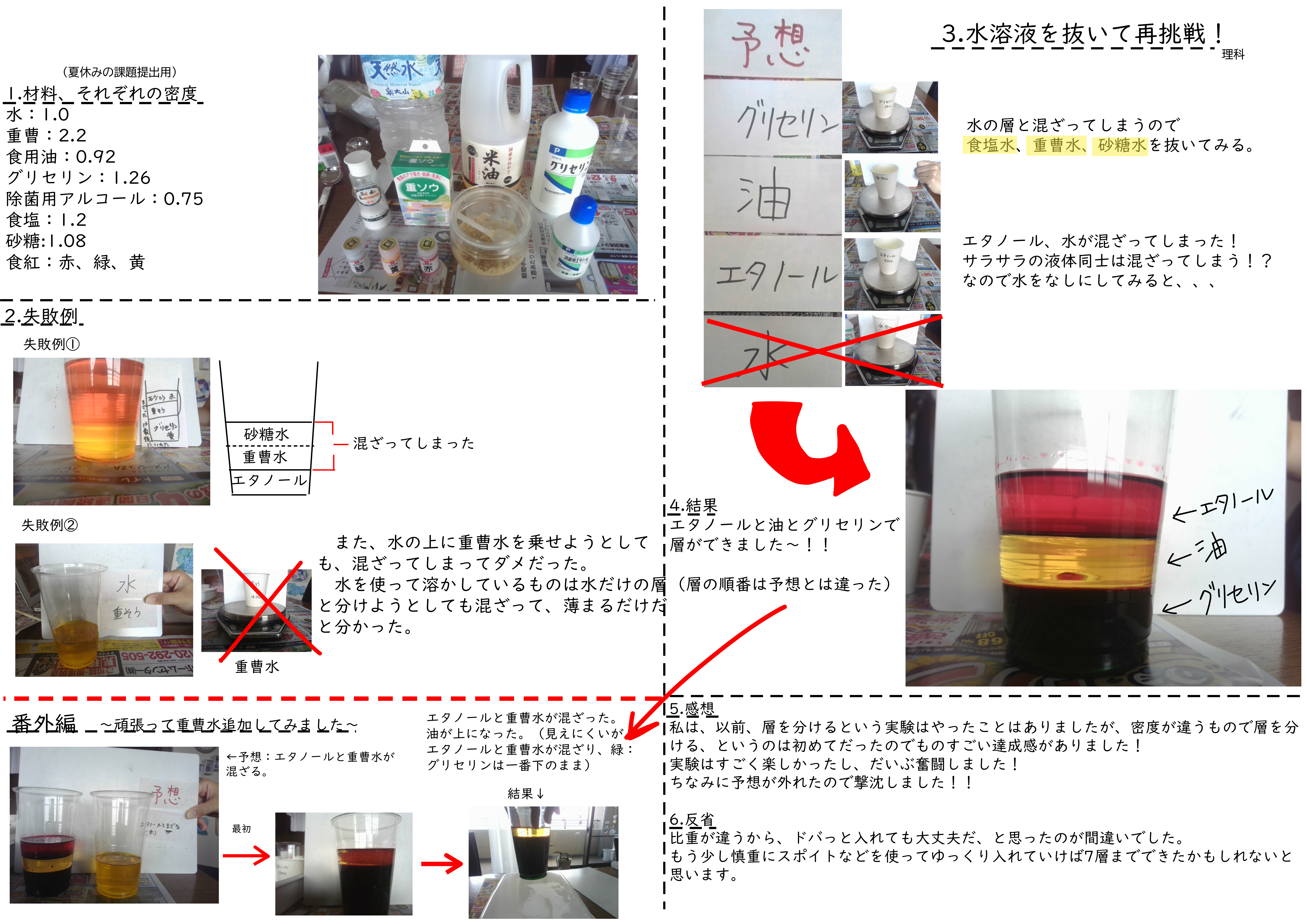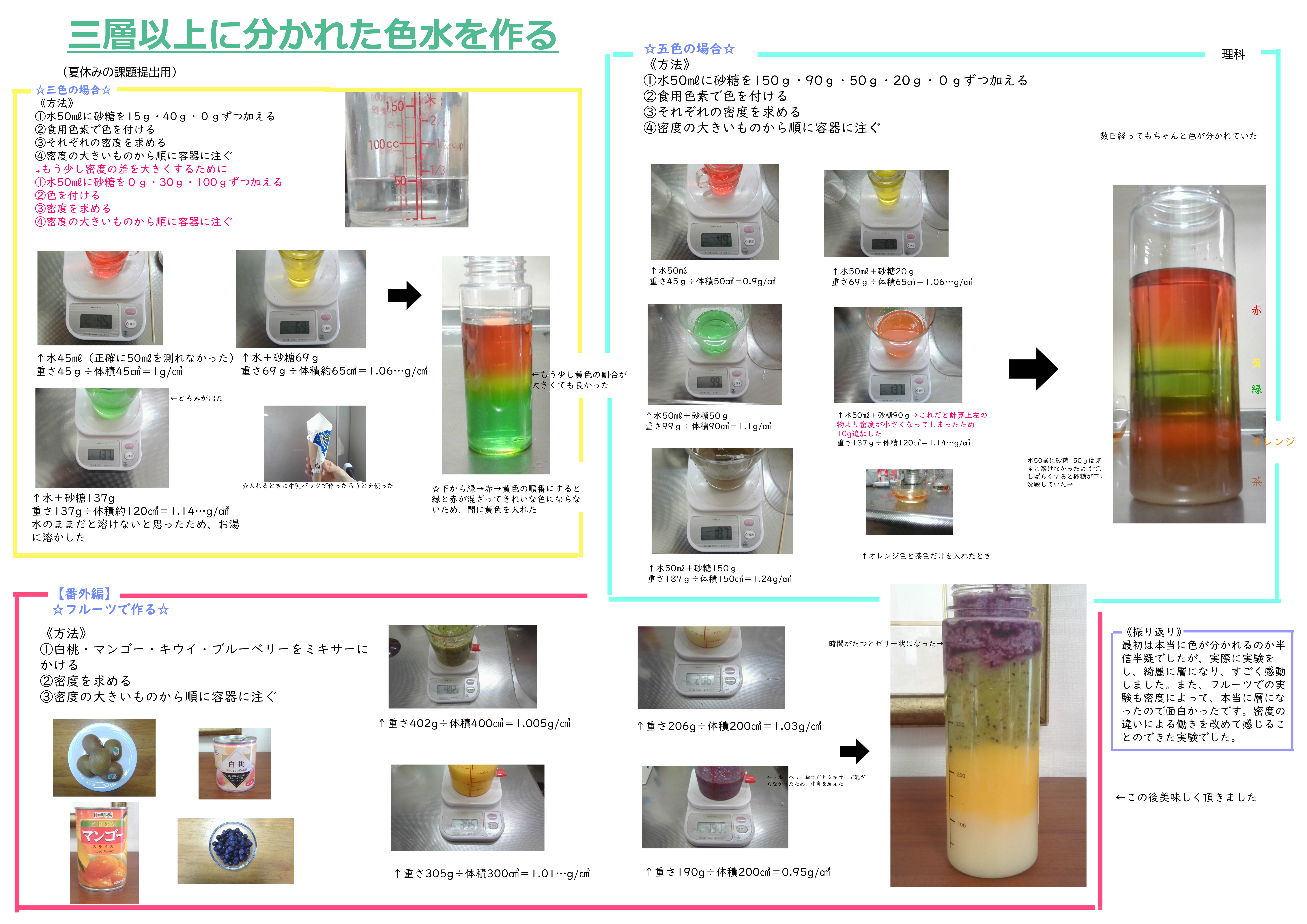 濃度の違いで層をつくった生徒と液体の種類の違いで層をつくった生徒がいた。