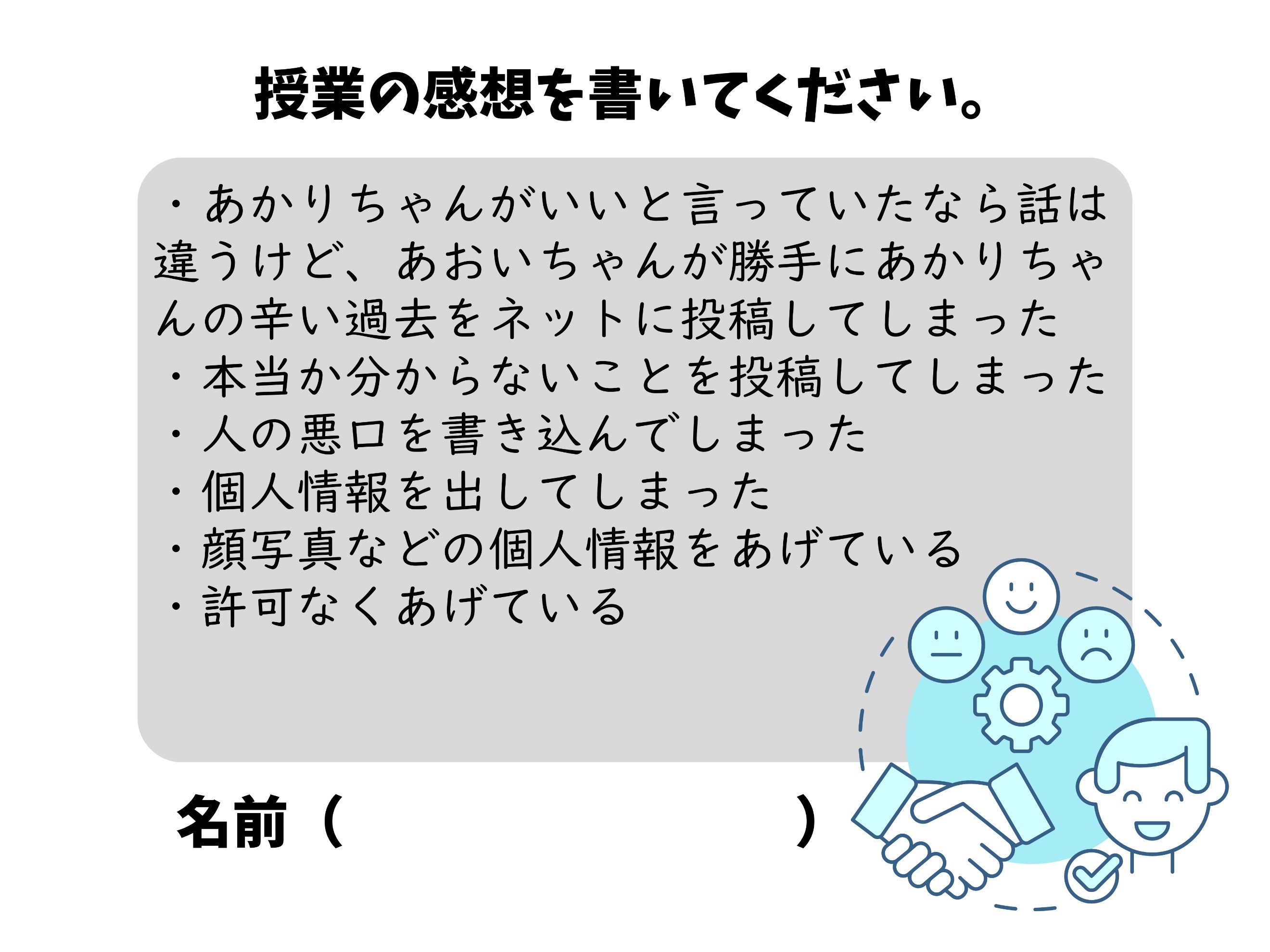 ・情報モラルに関わる題材を扱いながら,自他の権利を大切にし,世の中の秩序と規律を高めていこうとする道徳的心情を育む。