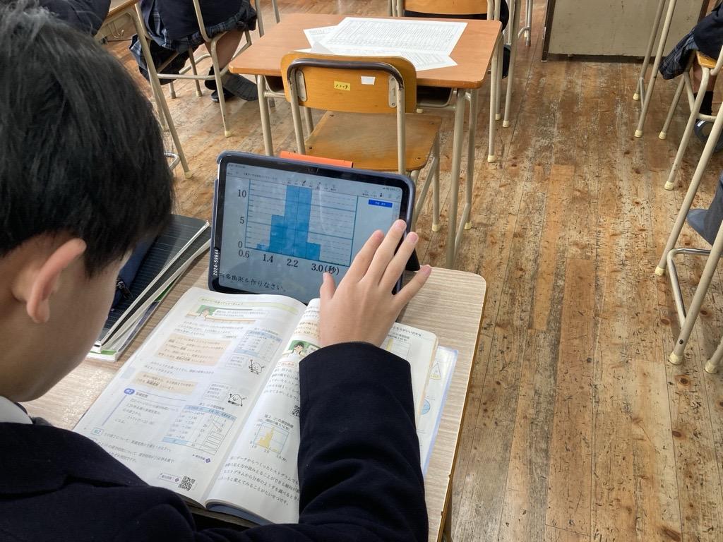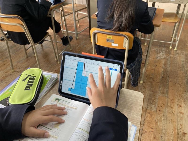 - 完成したヒストグラムや度数分布多角形をグループ化して重ねることができ、ワークシート上ではできない比較検討を行うことができた。