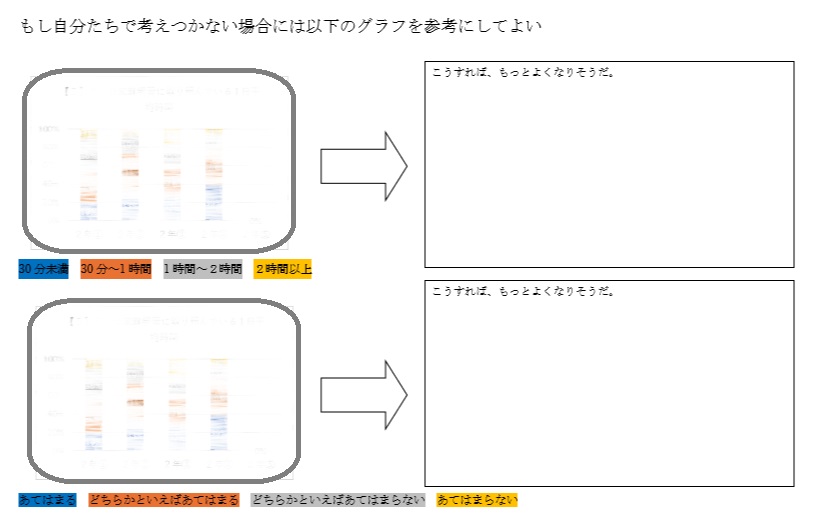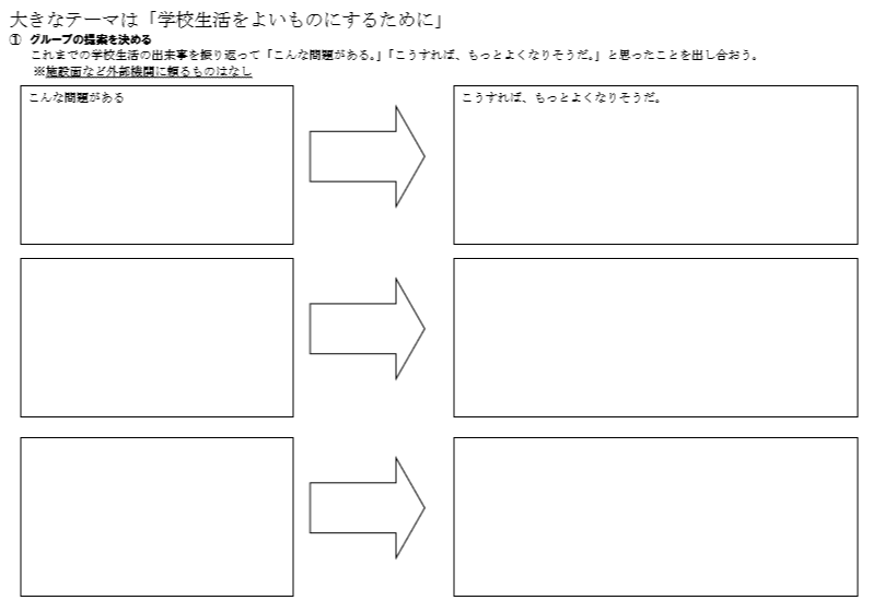 自由に考える場合と学校アンケートを基にした自分たちの現状から課題を捉えさせる。