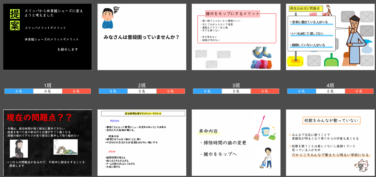 どのクラスが優秀な発表であったかはアンケート機能を用いて投票を行う。