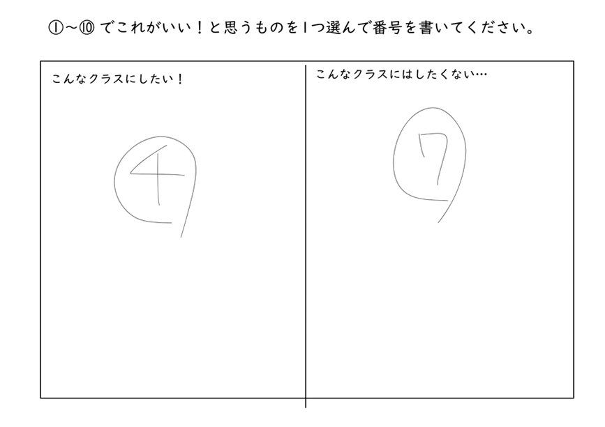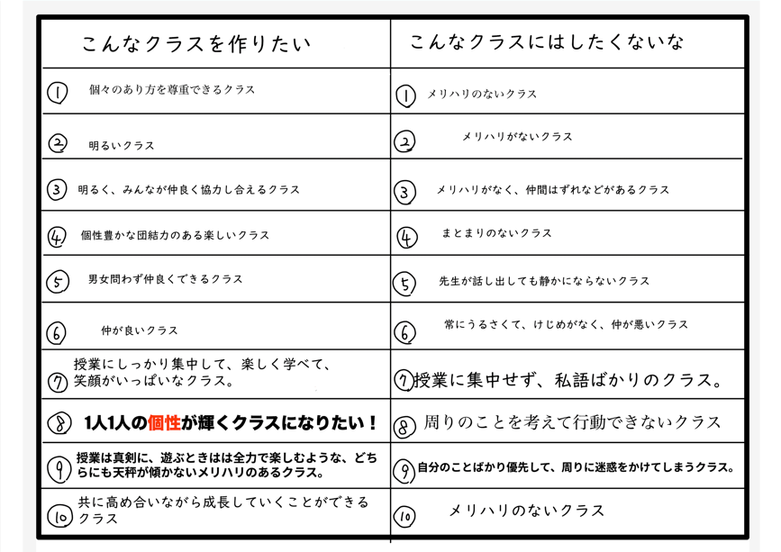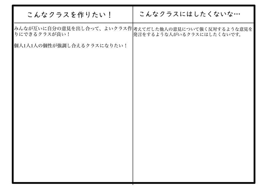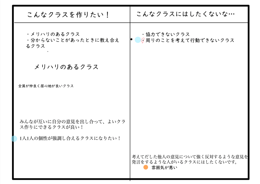 MetaMoJi ClassRoomに「こんなクラスにしたい!/こんなクラスにはしたくない!」というテーマで各自アイデアを書いてもらう。なぜそのようなクラスを作りたいかという理由も併せて考える。個別学習ページに自分のアイデアを書き込んでいく。