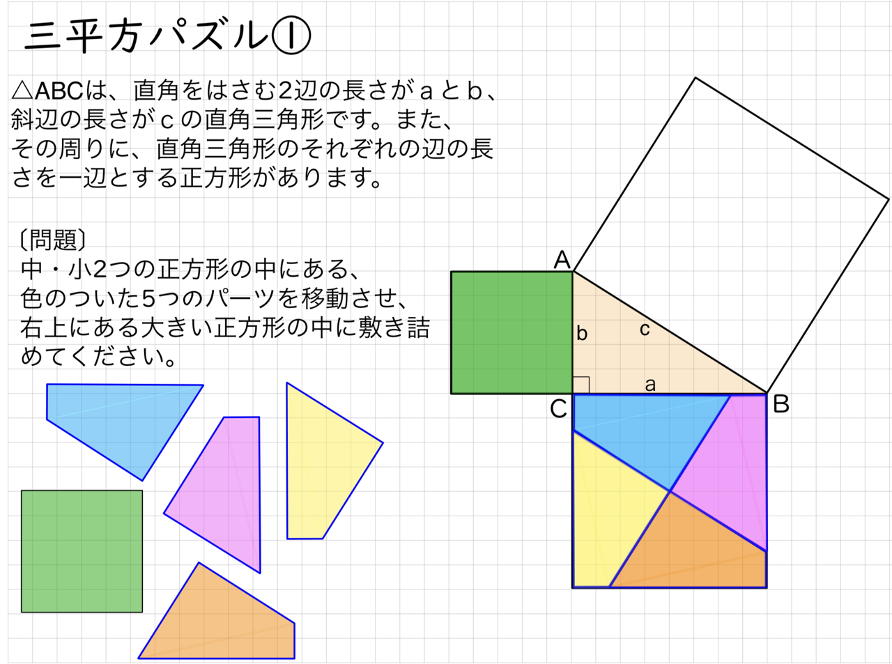 - パズルの結果から、直角三角形の斜辺以外のそれぞれの辺の長さの2乗の和が、斜辺の長さの2乗と等しいことに気づく。